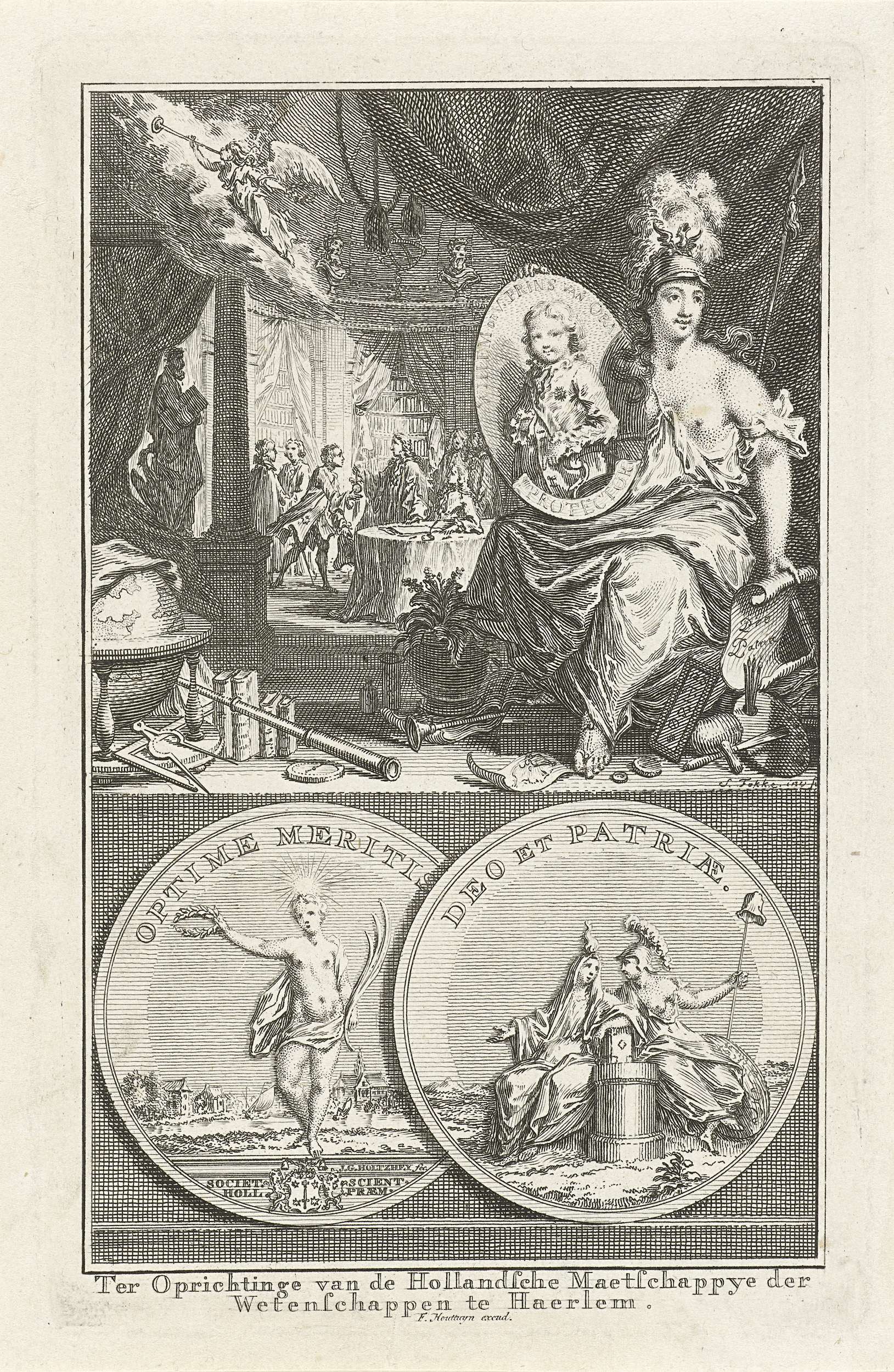 Allegorie op de oprichting van de Hollandsche Maatschappij der Wetenschappen te Haarlem op 21 mei 1752. Boven Minerva met een portret van de beschermheer prins Willem V, op de achtergrond een bijeenkomst van wetenschappers. Onder de zijden van een gedenkpenning met naakte Waarheid met zon op hoofd, houdt in linkerhand een palmtak en in rechterhand ...