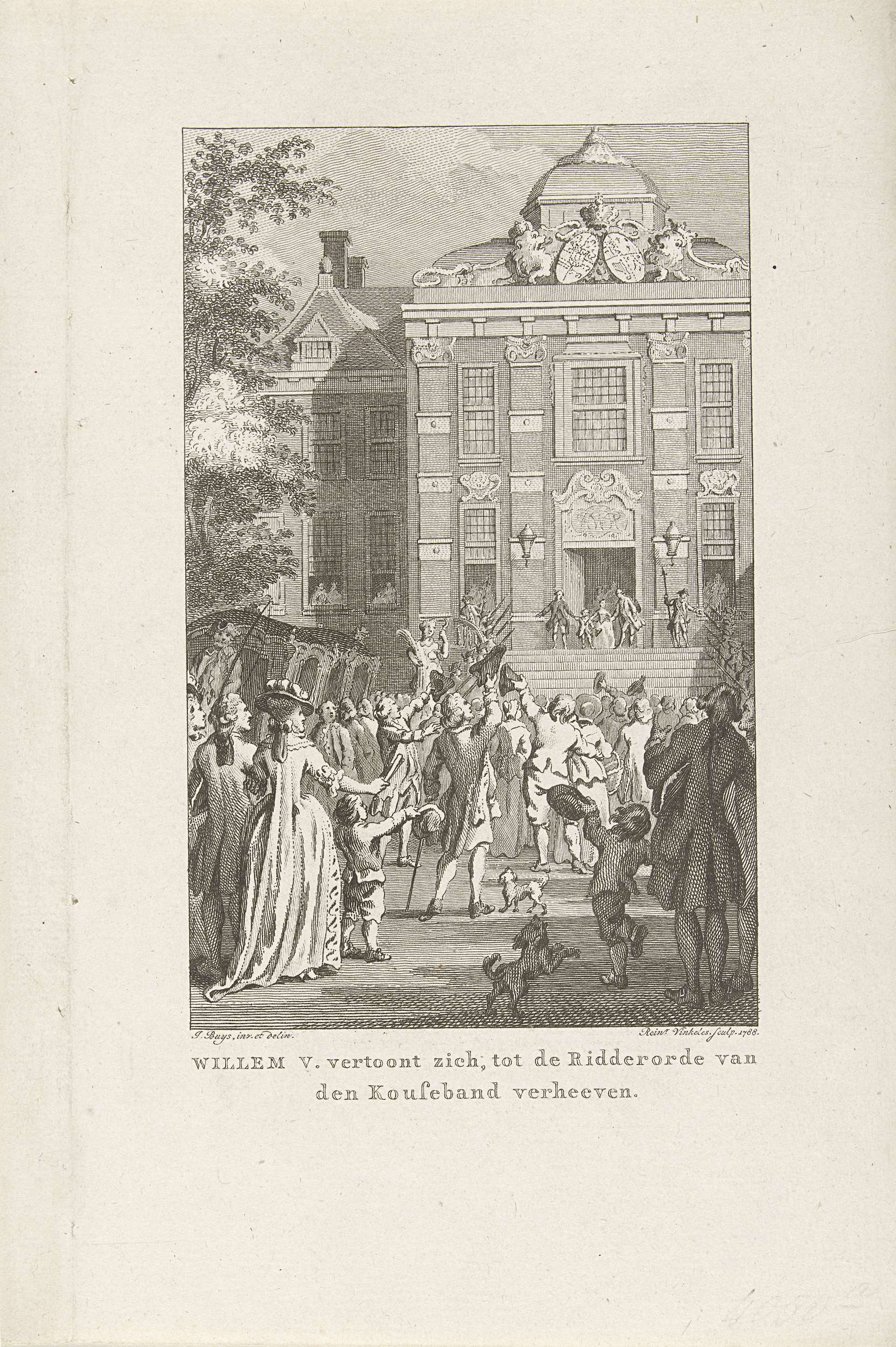 De jonge prins Willem V vertoont zich na zijn installatie als Ridder in de Orde van de Kousenband op het bordes van Paleis Huis Ten Bosch, 5 juni 1752. Op de straat voor het paleis wordt hij toegejuichd door een verzamelde menigte.