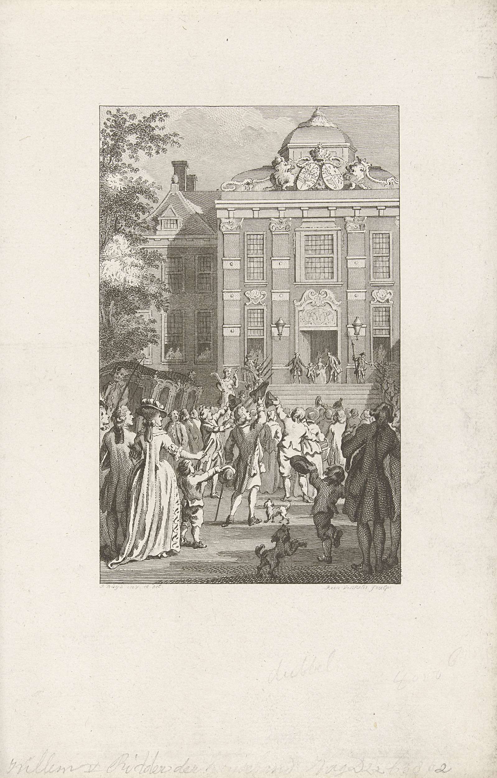 De jonge prins Willem V vertoont zich na zijn installatie als Ridder in de Orde van de Kousenband op het bordes van Paleis Huis Ten Bosch, 5 juni 1752. Op de straat voor het paleis wordt hij toegejuichd door een verzamelde menigte.