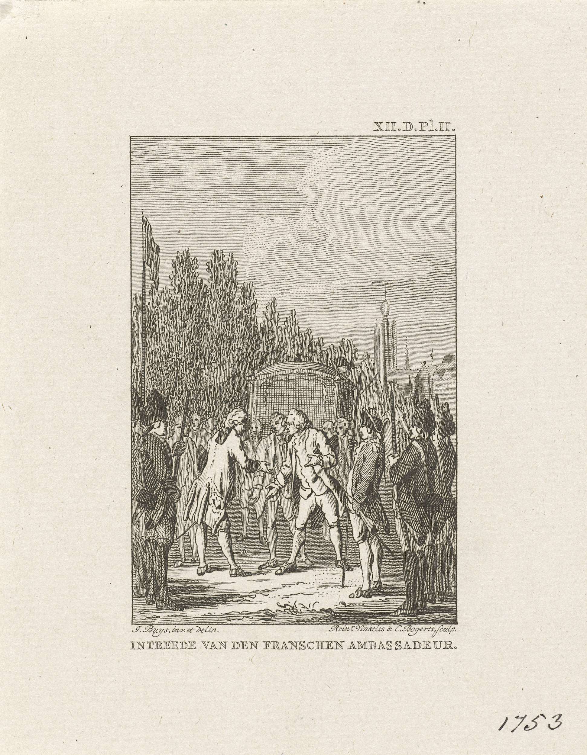 Ontvangst van de Franse ambassadeur de Marquis de Bonac te Delft op 20 april 1753. De ambassadeur wordt bij zijn rijtuig verwelkomd door een gezant van de burgemeester van de stad. Gemerkt rechtsboven: XII.D.Pl.II.