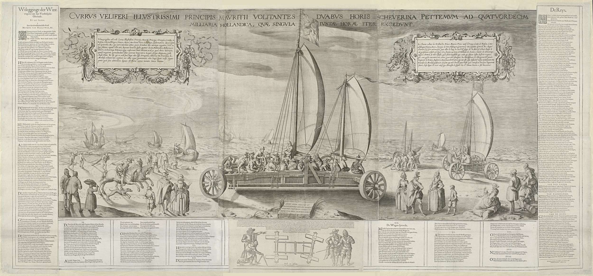 De zeilwagen van Simon Stevin, 1602. Prins Maurits maakt samen met een groep vrienden een tocht over het strand van Scheveningen naar Petten in de zeilwagen gebouwd door Simon Stevin, april-mei 1602. In het midden zit de prins tussen zijn vrienden in de grote wagen. Daaronder een stenen tablet met opschrift in het Latijn (de ...