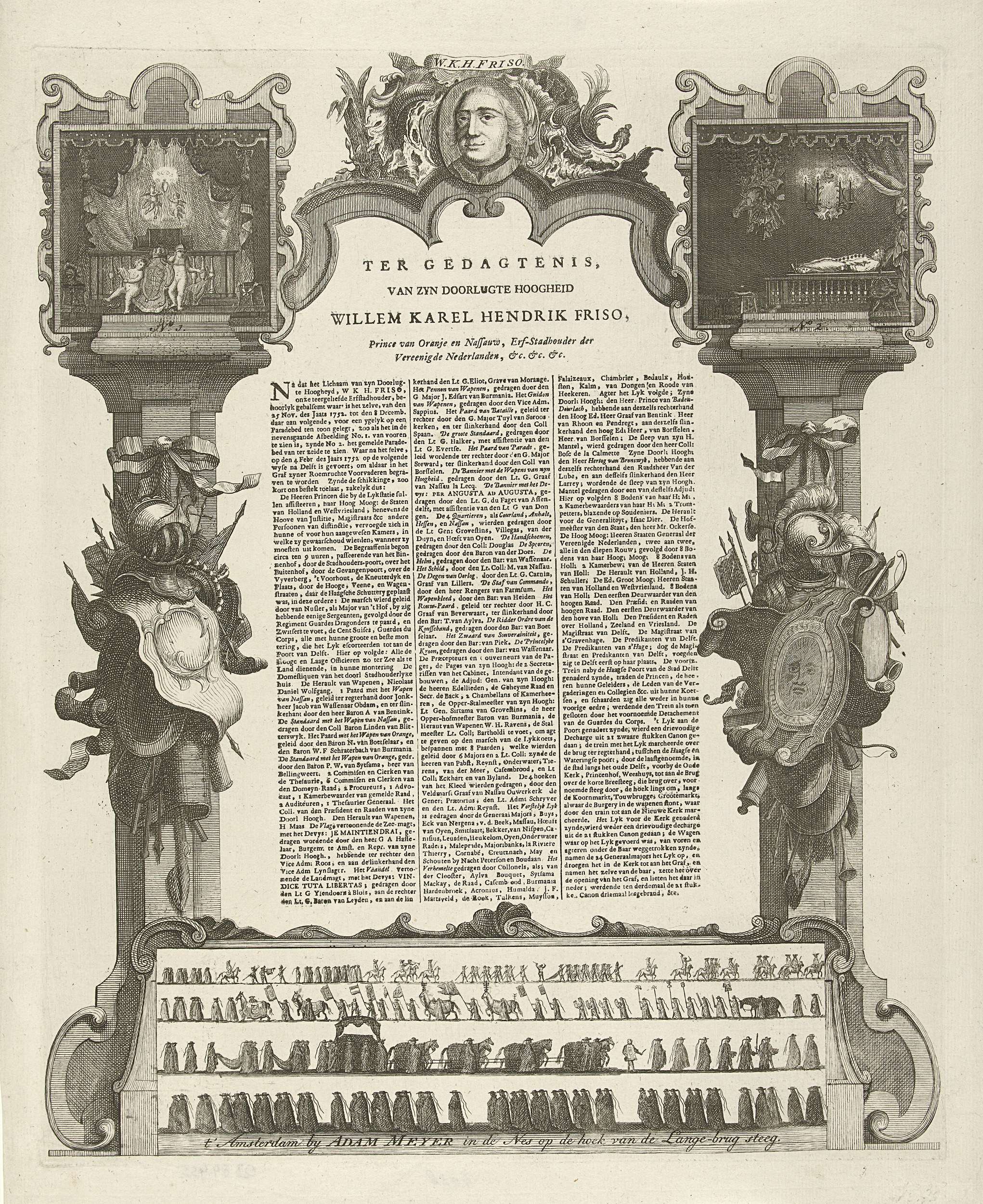 Prent ter nagedachtenis aan stadhouder Willem IV. Aan weerszijden van een tekst met een beschrijving van de lijkstatie staan twee zuilen met wapentrofeeën met bovenaan twee voorstellingen van het paradebed met het lichaam van de prins, genummerd No. 1 en No. 2. Bovenaan ook een kleine portret. Onderaan in vier rijen de begrafenisstoet te Delft ...