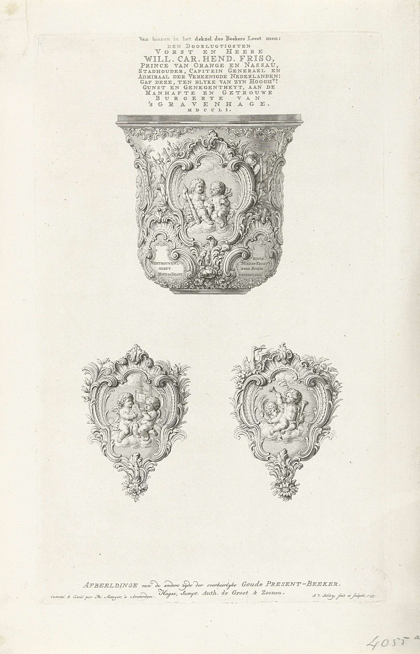 Een gouden beker door stadhouder Willem IV toegezegd aan de Haagse schutterij en na zijn dood gepresenteerd door prinses Anna op 8 mei 1753. Blad met drie details van de voorstellingen op de beker en de inscriptie aangebracht aan de binnenzijde van de deksel. De beker vervaardigd door Philippe Métayer te Amsterdam.