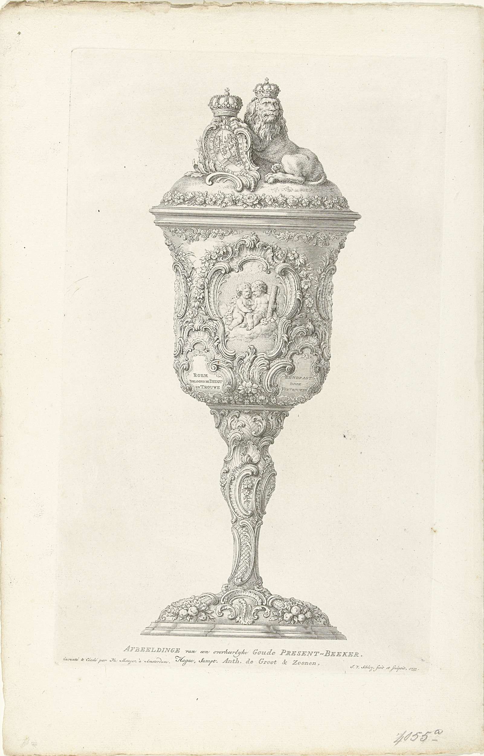 Een gouden beker door stadhouder Willem IV toegezegd aan de Haagse schutterij en na zijn dood gepresenteerd door prinses Anna op 8 mei 1753. Op deze voorstelling de beker als geheel. De beker vervaardigd door Philippe Métayer te Amsterdam.