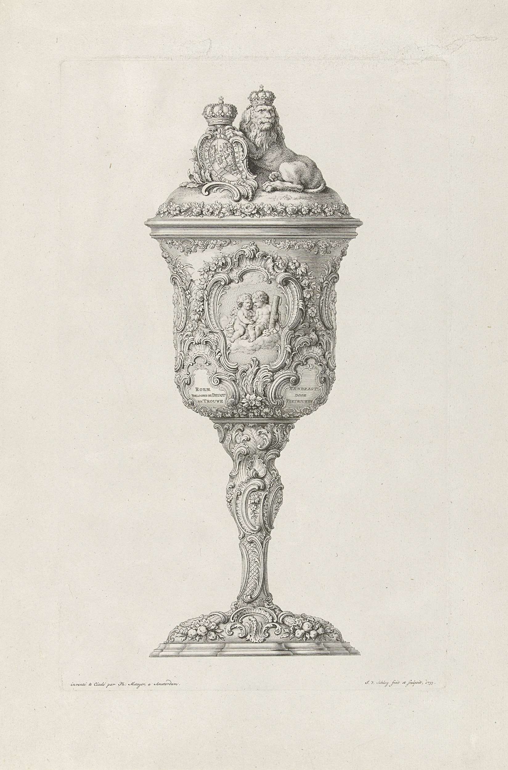 Een gouden beker door stadhouder Willem IV toegezegd aan de Haagse schutterij en na zijn dood gepresenteerd door prinses Anna op 8 mei 1753. Op deze voorstelling de beker als geheel. De beker vervaardigd door Philippe Métayer te Amsterdam.