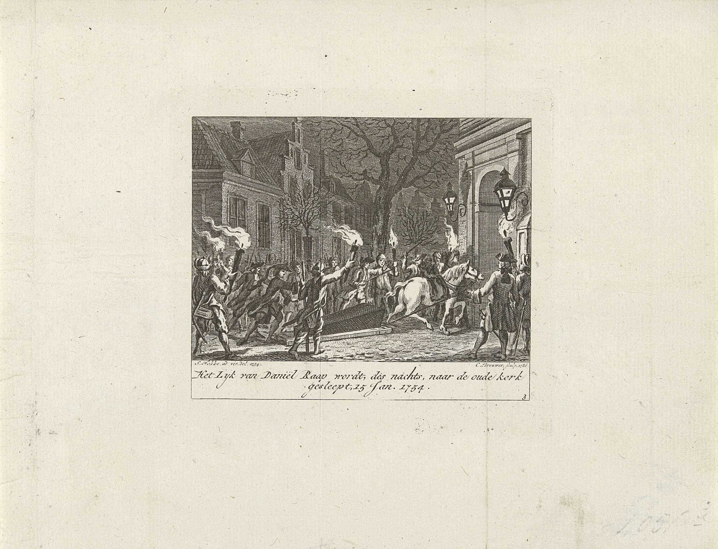 De doodskist met het lichaam van de koopman en orangist Daniël Raap wordt 's nachts naar de Oude Kerk gesleept, 15 januari 1754. Onderdeel van een groep van vier illustraties van de ongeregeldheden bij de begrafenis van Daniël Raap te Amsterdam. Genummerd rechtsonder: 3.
