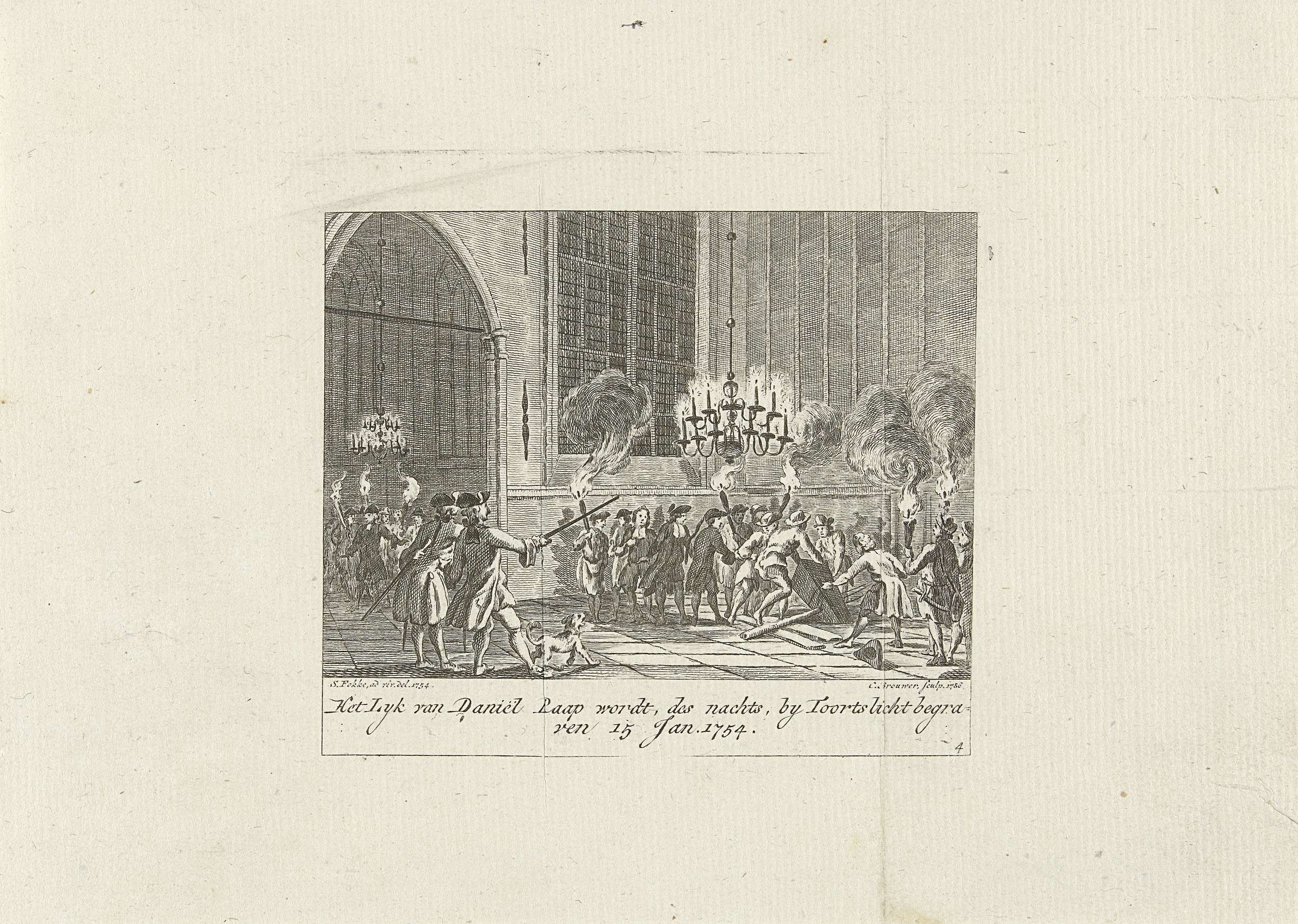 De doodskist met het lichaam van de koopman en orangist Daniël Raap wordt 's nachts in de Oude Kerk begraven, 15 januari 1754. Onderdeel van een groep van vier illustraties van de ongeregeldheden bij de begrafenis van Daniël Raap te Amsterdam. Genummerd rechtsonder: 4.