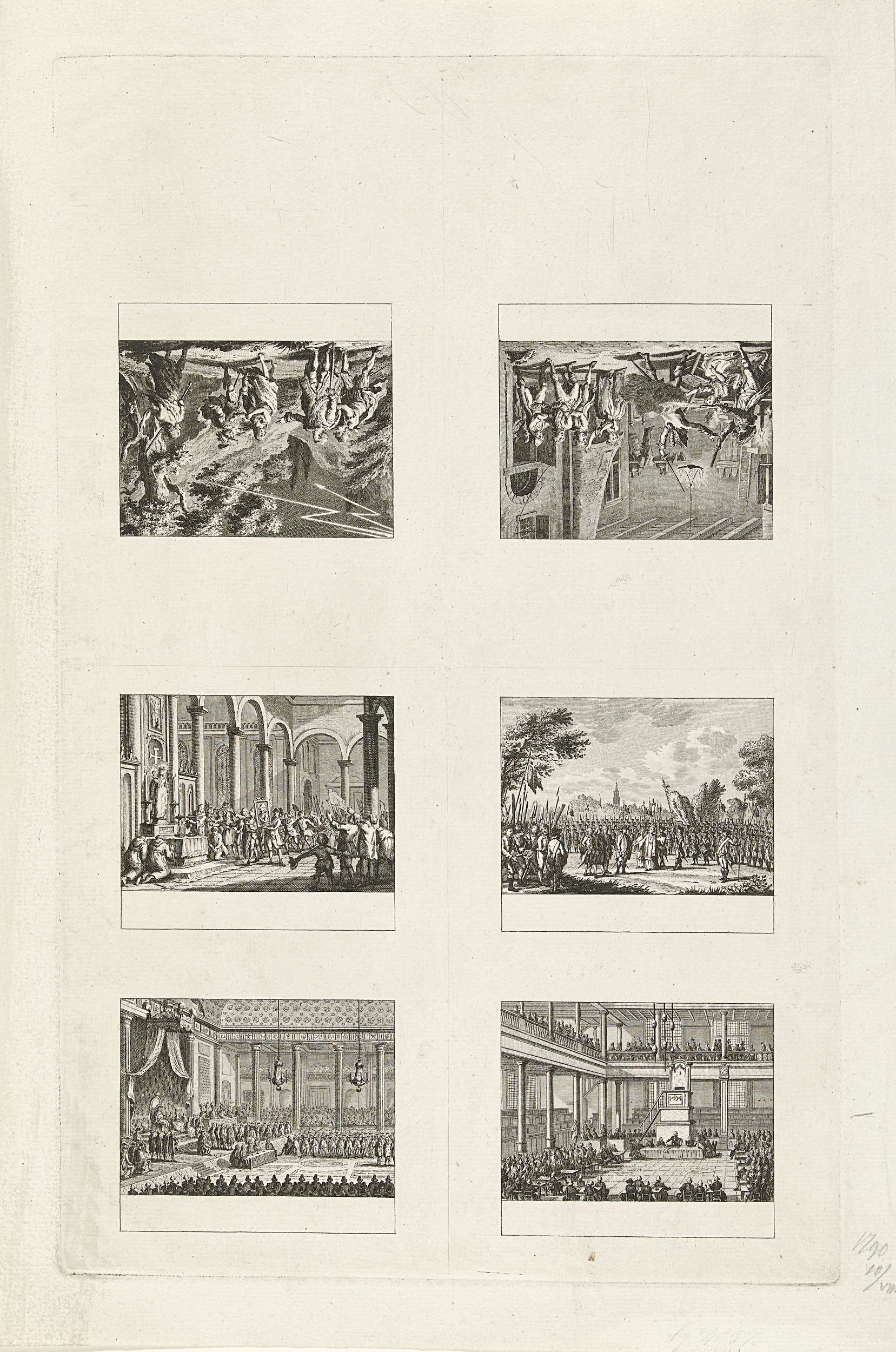 Onversneden vel met 6 voorstellingen op één koperplaat, waarvan 4 van historische gebeurtenissen en 2 illustraties voor een onbekende roman. Voorstellingen van: 1) het plaatsen van het portret van Van der Noot op het altaar van een kerk te Brussel, 17 juni 1790; 2) het inzegenen van het vaandel van de H. Lambertus buiten Luik ...