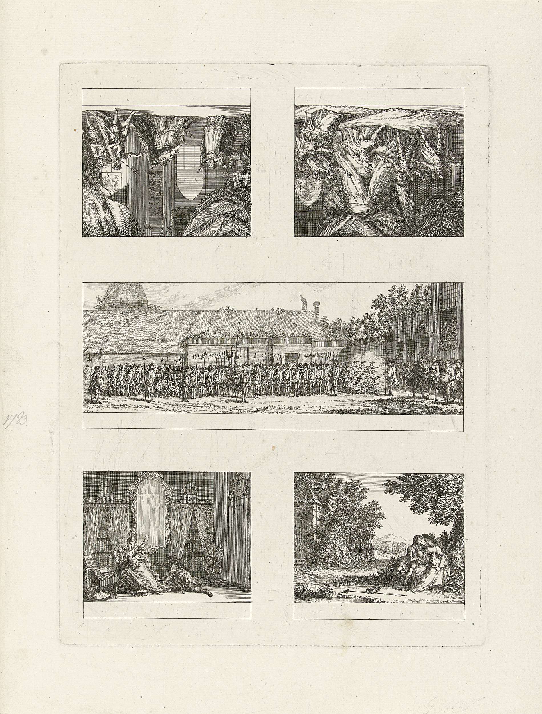 Onversneden vel met 5 voorstellingen op één koperplaat, waarvan 1 van een historische gebeurtenis en 4 illustraties voor een onbekende roman. Voorstelling van de exercitie van de Amsterdamse Burgerij op het Drilveld in tegenwoordigheid van de Baron van der Capellen tot den Pol, 26 april 1783.