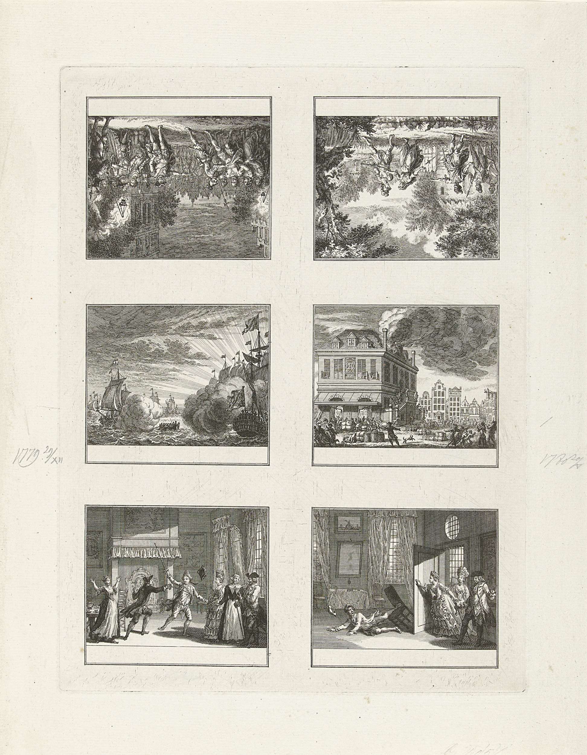 Onversneden vel met 6 voorstellingen op één koperplaat, waarvan 2 van historische gebeurtenissen en 4 illustraties voor een onbekende roman. Voorstelling van: 1) de aanval van de Engelse commandant Fielding op het gewapende konvooi van de schout-bij-nacht Bijland op 31 december 1779; 2) brand in de Waag op de Dam te Amsterdam op 20 mei ...