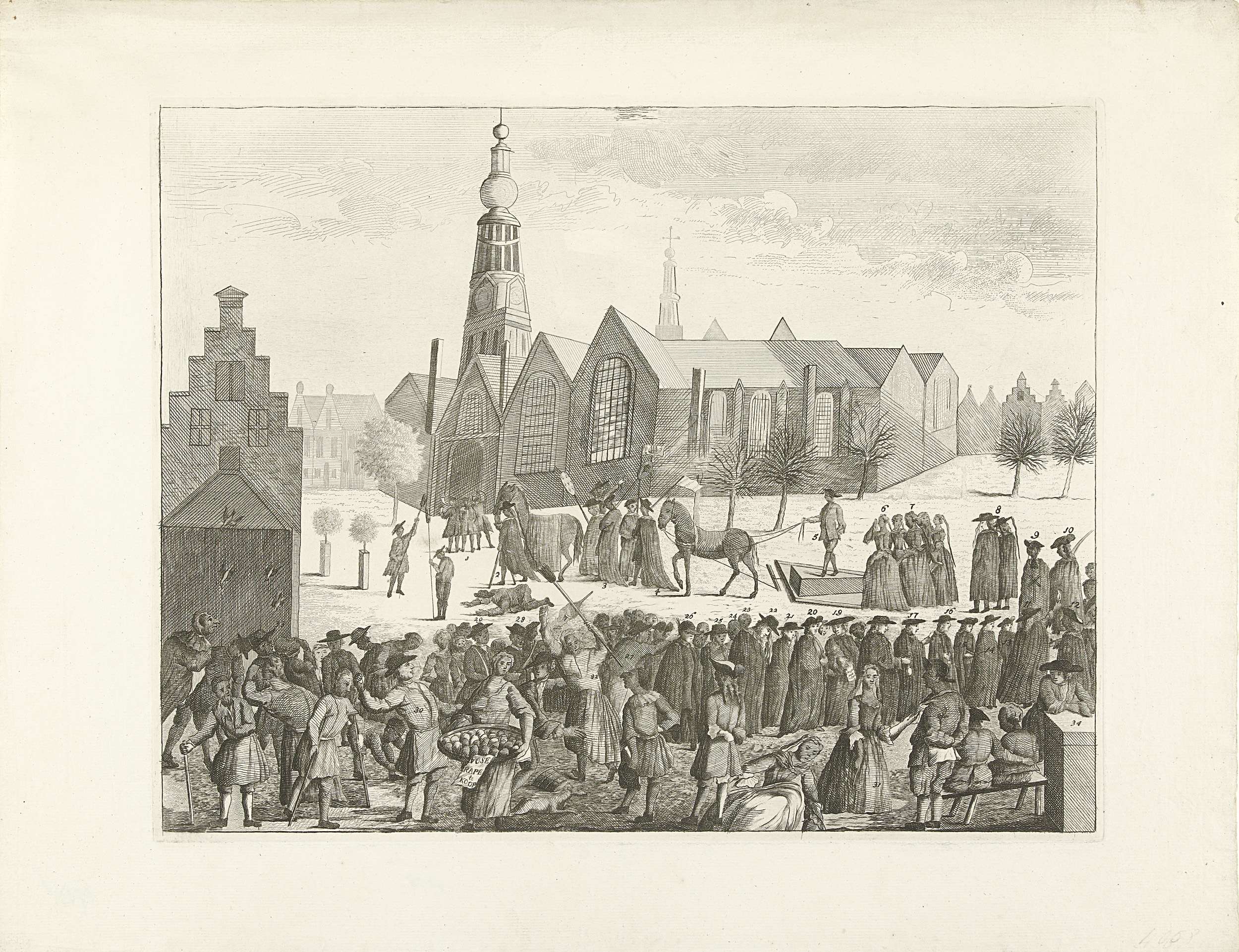 Spotprent op de begrafenis van de koopman en Orangist Daniël Raap, 15 januari 1754. De begrafenisstoet met de lijkkist op een slee getrokken door een paard trekt over het Oudekerksplein op richting Oude Kerk te Amsterdam. Op de voorgrond toeschouwers en een rapenverkoopster.