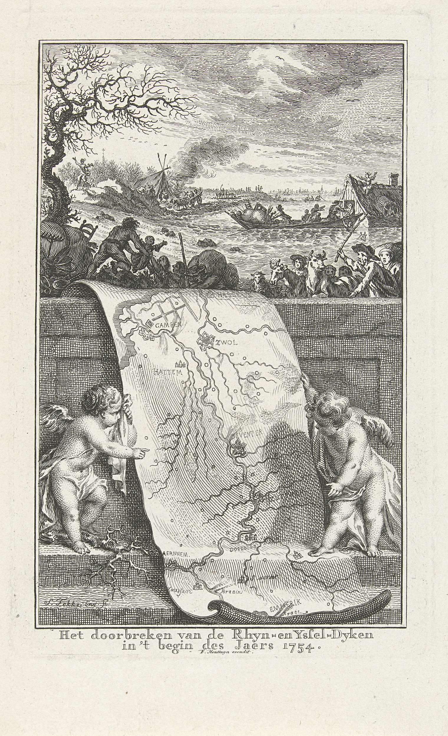 Watersnood na het doorbreken van de rivierdijken langs de Rijn en de IJssel, januari 1754. Onderaan twee putti met een kaart van het rivierengebied tussen Kampen en Emmerich, bovenaan ontvluchten bewoners het overstroomde land met huisraad en vee.