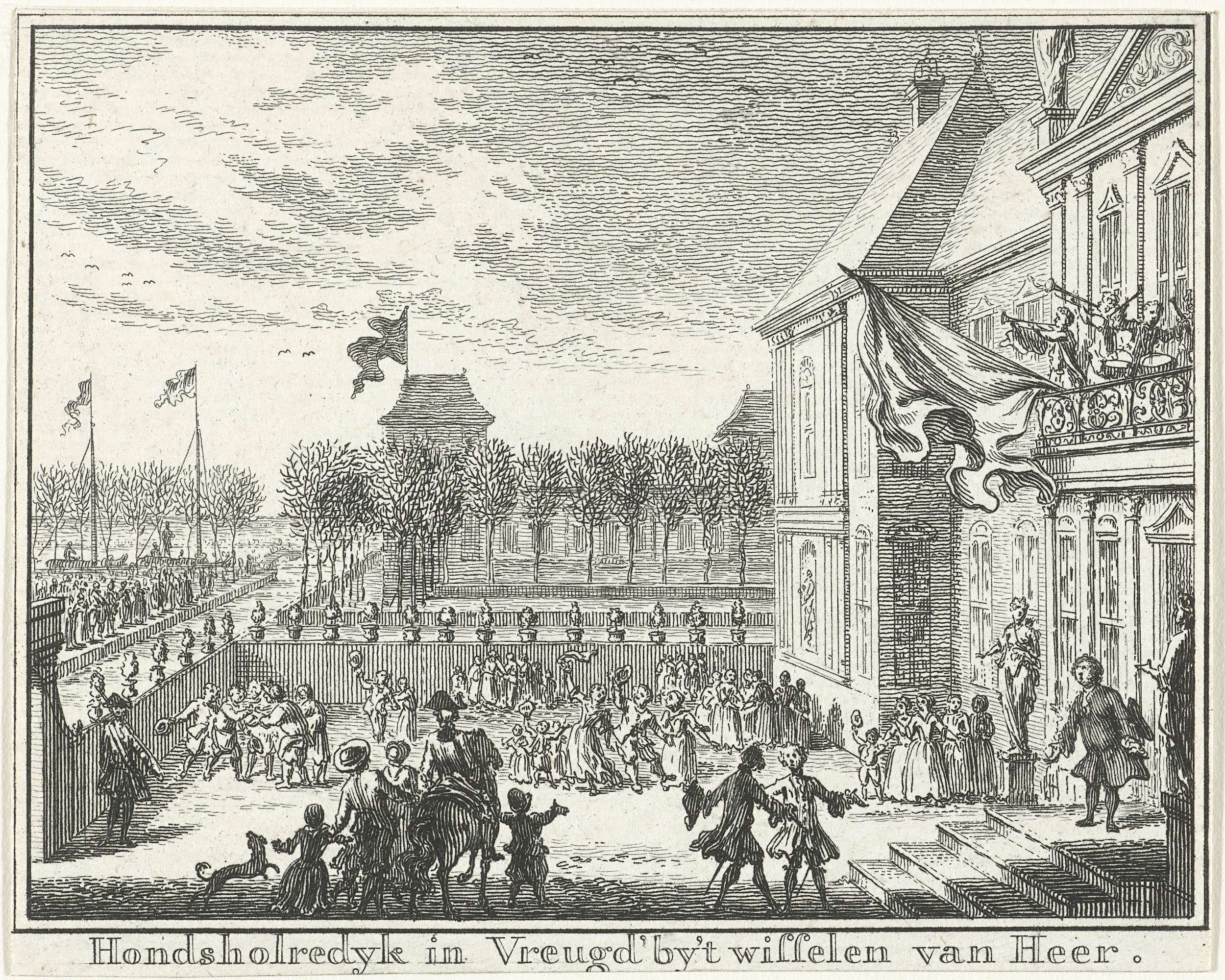 Gezicht op de buitenkant van Paleis Honselaarsdijk met een vrolijke menigte tijdens de wisseling van eigenaar, 1754. Het paleis werd als onderdeel van de Pruisische heerlijkheden in Holland door Frederik de Grote verkocht aan Anna van Hannover op 21 februari 1754. Anna van Hannover kocht de Pruisische heerlijkheden in Holland als geheel voor f. 700.000 ...