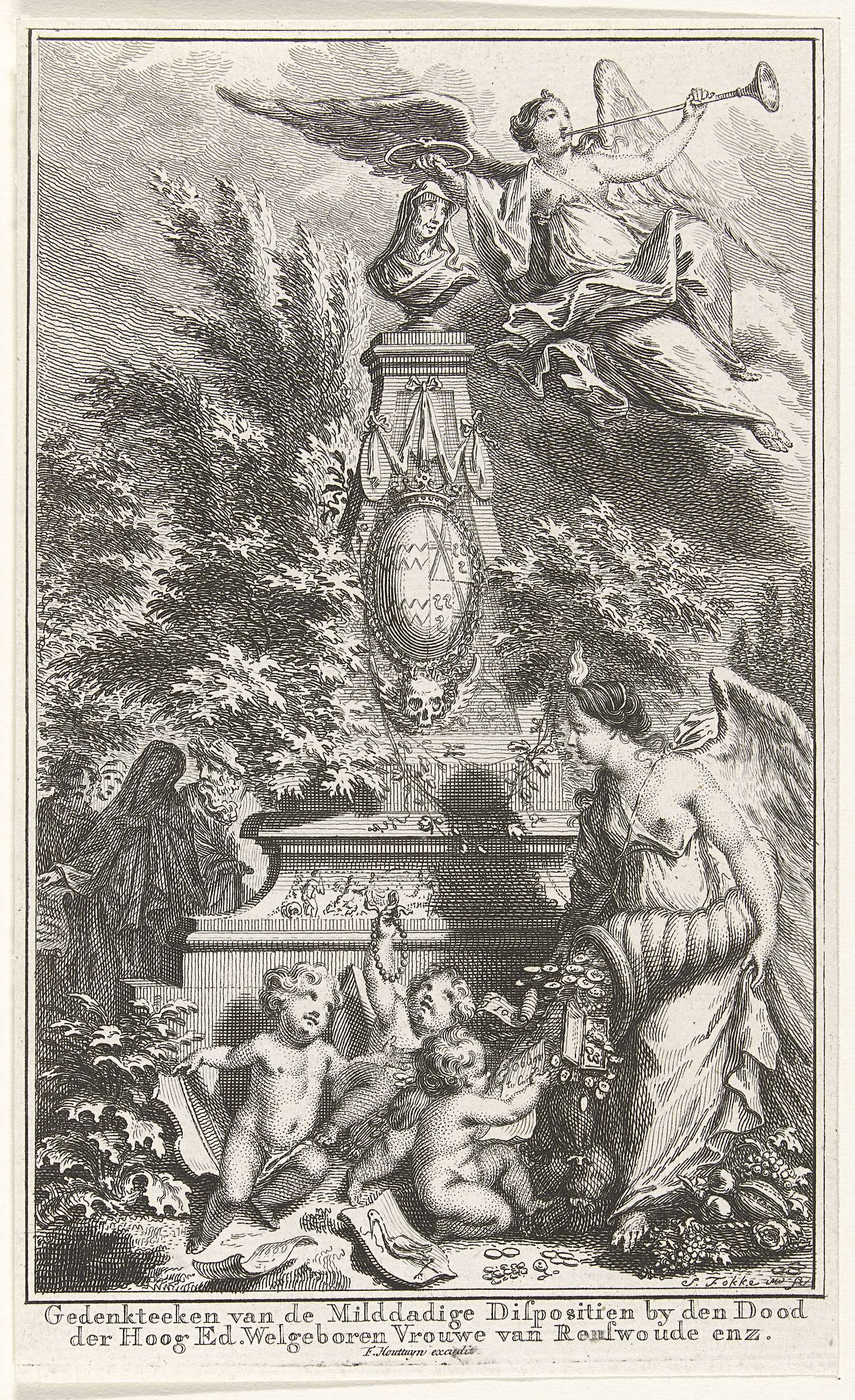 Allegorisch grafmonument op het overlijden van Maria Duyst van Voorhout, vrijvrouwe van Renswoude, op 26 april 1754. Bij het monument stort de Milddadigheid een hoorn van overvloed gevuld met rijkdommen uit over drie kleine naakte jongetjes, symbool voor het vermogen dat Maria Duyst van Voorhout bij haar overlijden naliet aan het armenonderwijs (Fundaties van Renswoude). ...
