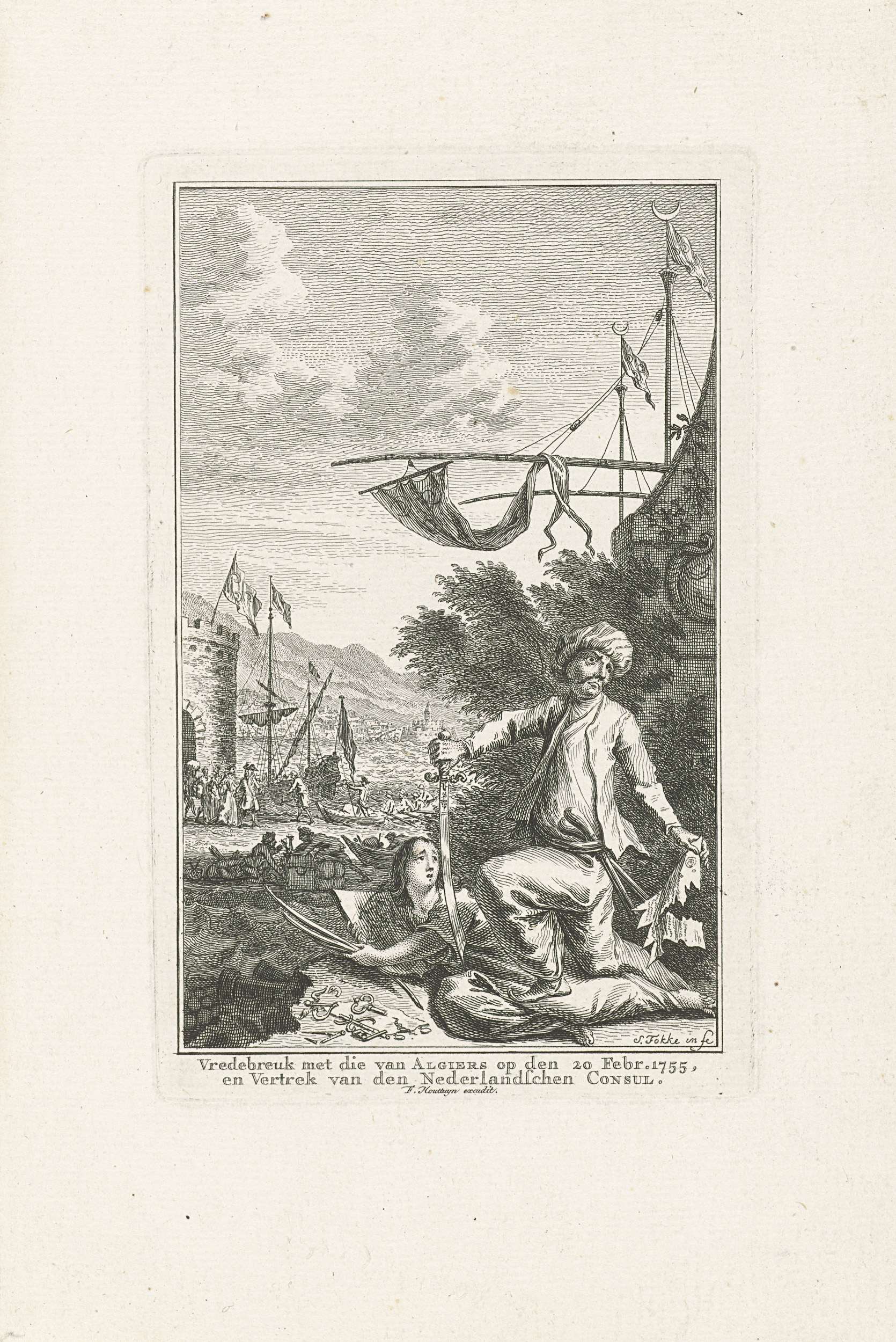 Allegorie op het verbreken van de vrede met Algiers en het daaropvolgende vertrek van de Nederlandse consul uit Algiers, 20 februari 1755. Een Algerijn (zeerover) met getrokken zwaard en verscheurd tractaat vertrapt een vrouwelijke personificatie (Vrije Koophandel?). Op de achtergrond verlaat de consul de stadspoort om aan boord van een schip te gaan.