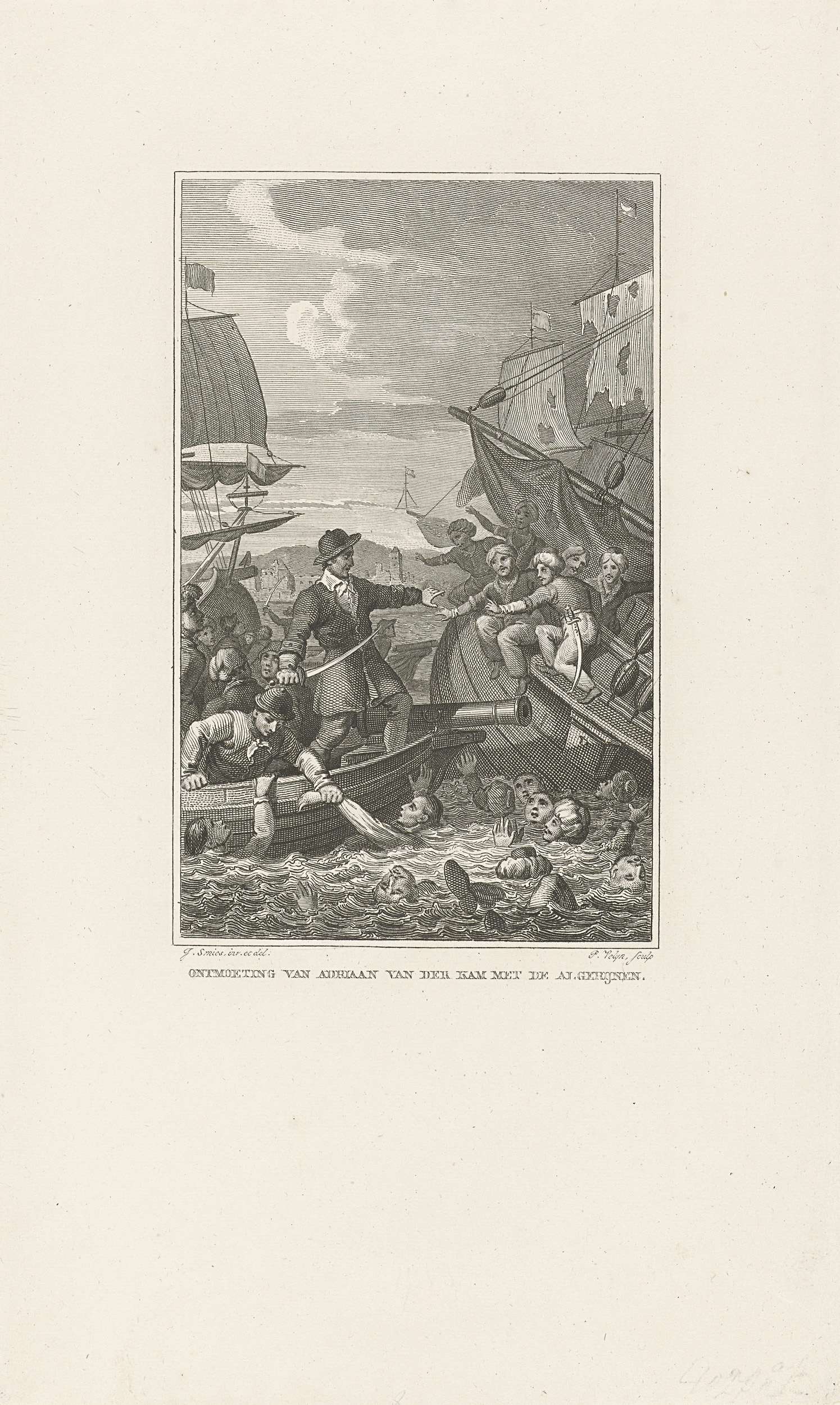 De Nederlandse commandeur Adriaan van der Kam nadat hij zich tijdens een gevecht tussen Spaanse en Algerijnse schepen uit slavernij kon bevrijden. Ook andere tot slaaf gemaakte christenen die op de Algerijnse boten zaten worden als drenkelingen uit het water gehaald.