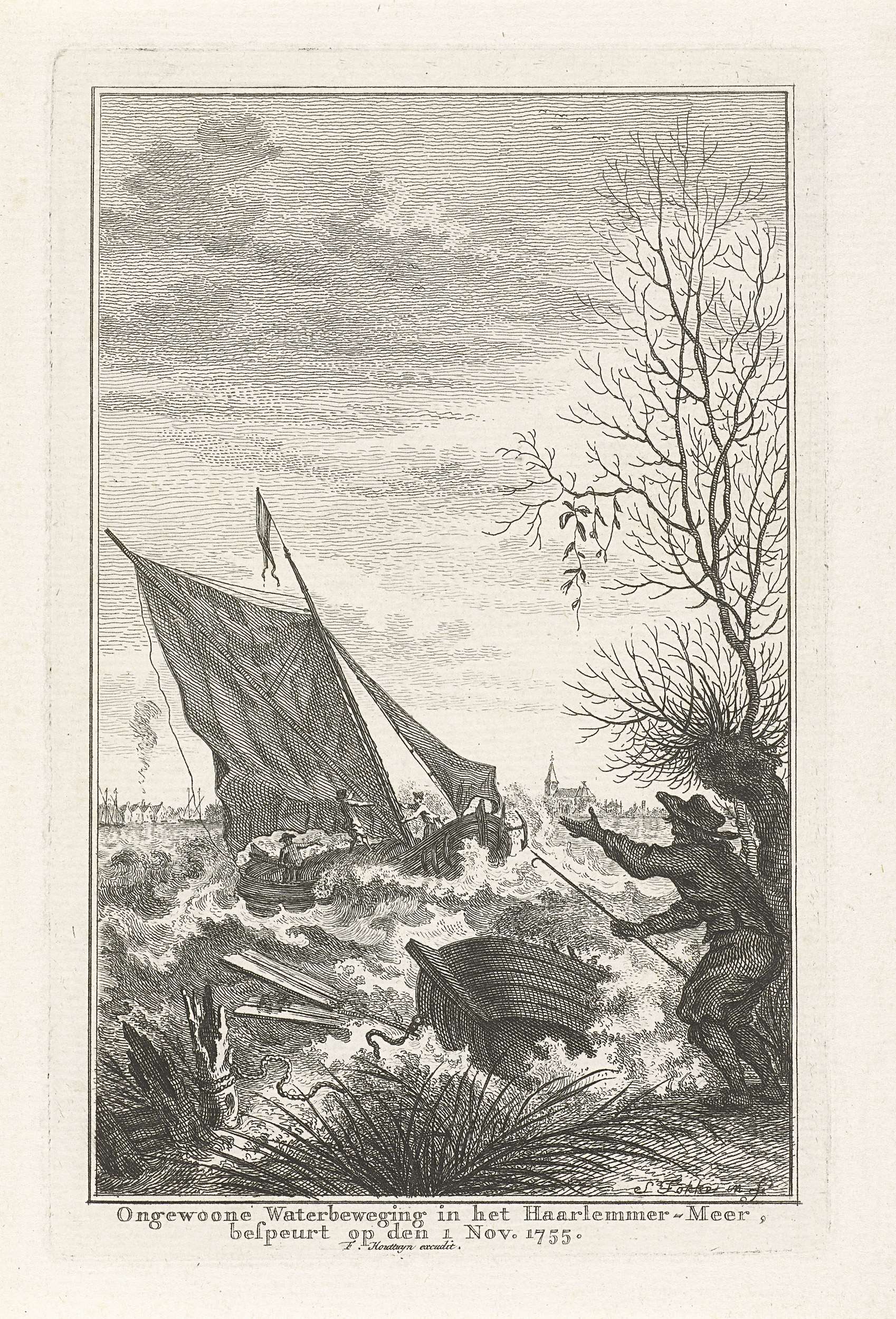 Ongewoon woelig water, tijdens rustig weer, in het Haarlemmermeer op 1 november 1755. Op het water boten in nood, aan de oever kijkt een man toe.