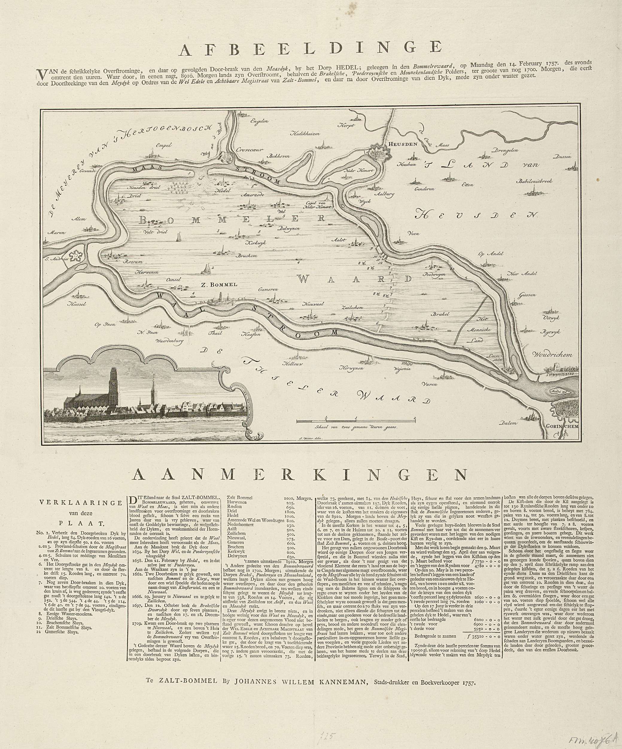 Kaart van het overstroomde gebied in de Bommelerwaard na het doorbreken van de rivierdijk langs de Maas bij het dorp Hedel op 14 februari 1757. Linksonder een cartouche met een gezicht op Zaltbommel. Op het blad onder de plaat onder Aanmerkingen een legenda 1-12 en een beschrijving van de gebeurtenissen in vijf kolommen.