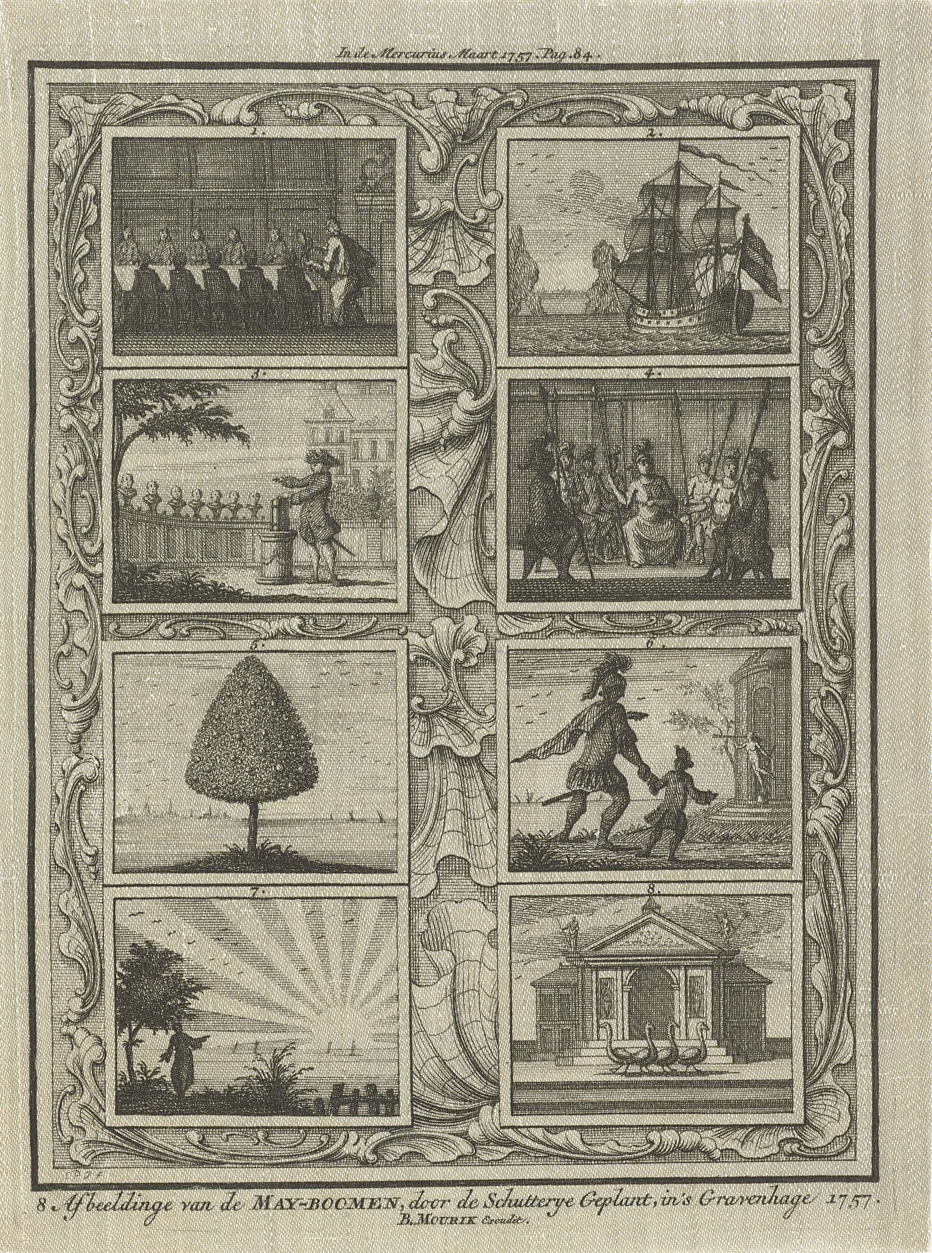 De acht allegorische voorstellingen of emblemen van de meiboom geplant door de Schutterij van Den Haag in het jaar 1757.