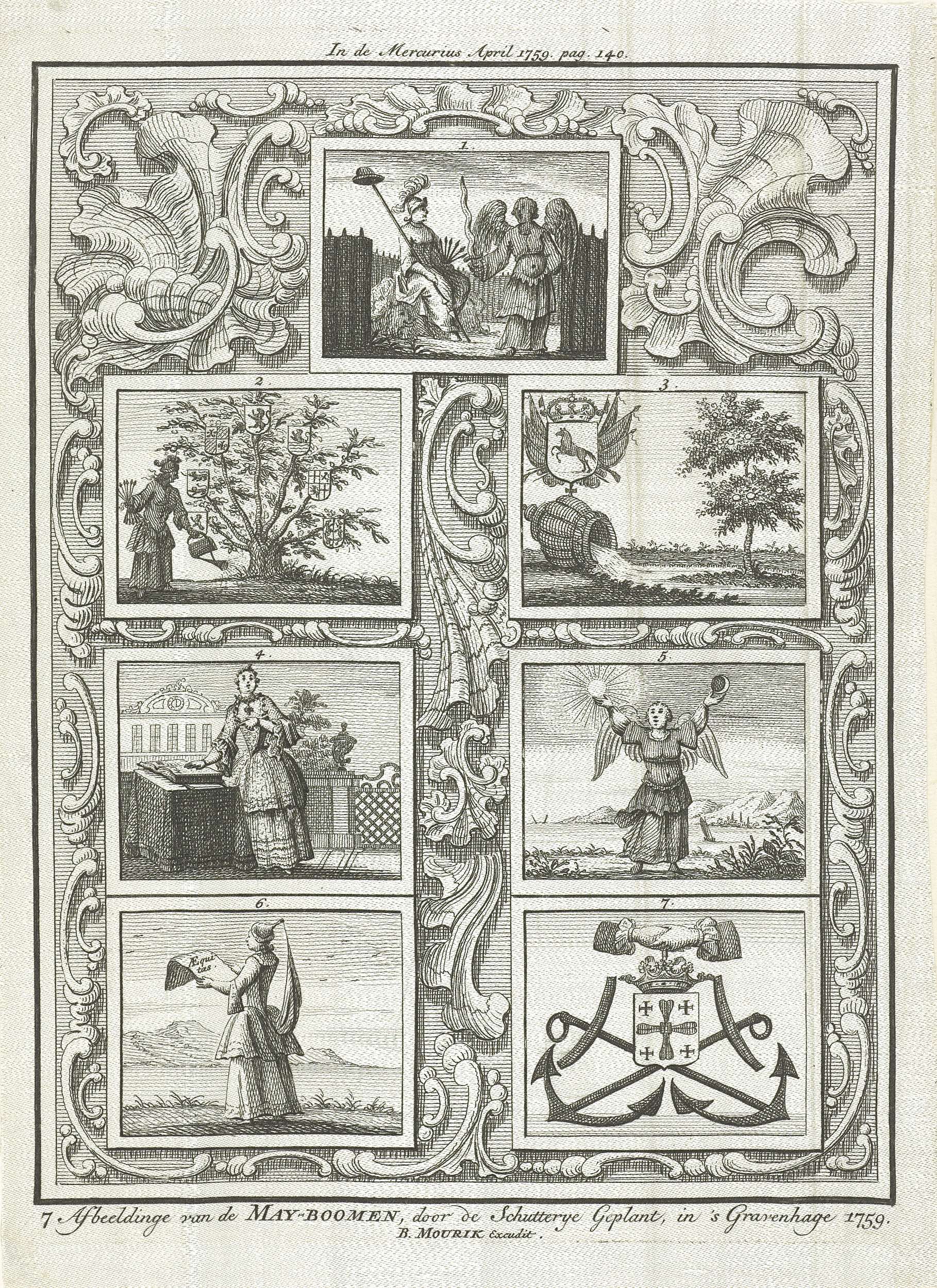 De zeven allegorische voorstellingen of emblemen van de meiboom geplant door de Schutterij van Den Haag in het jaar 1759.