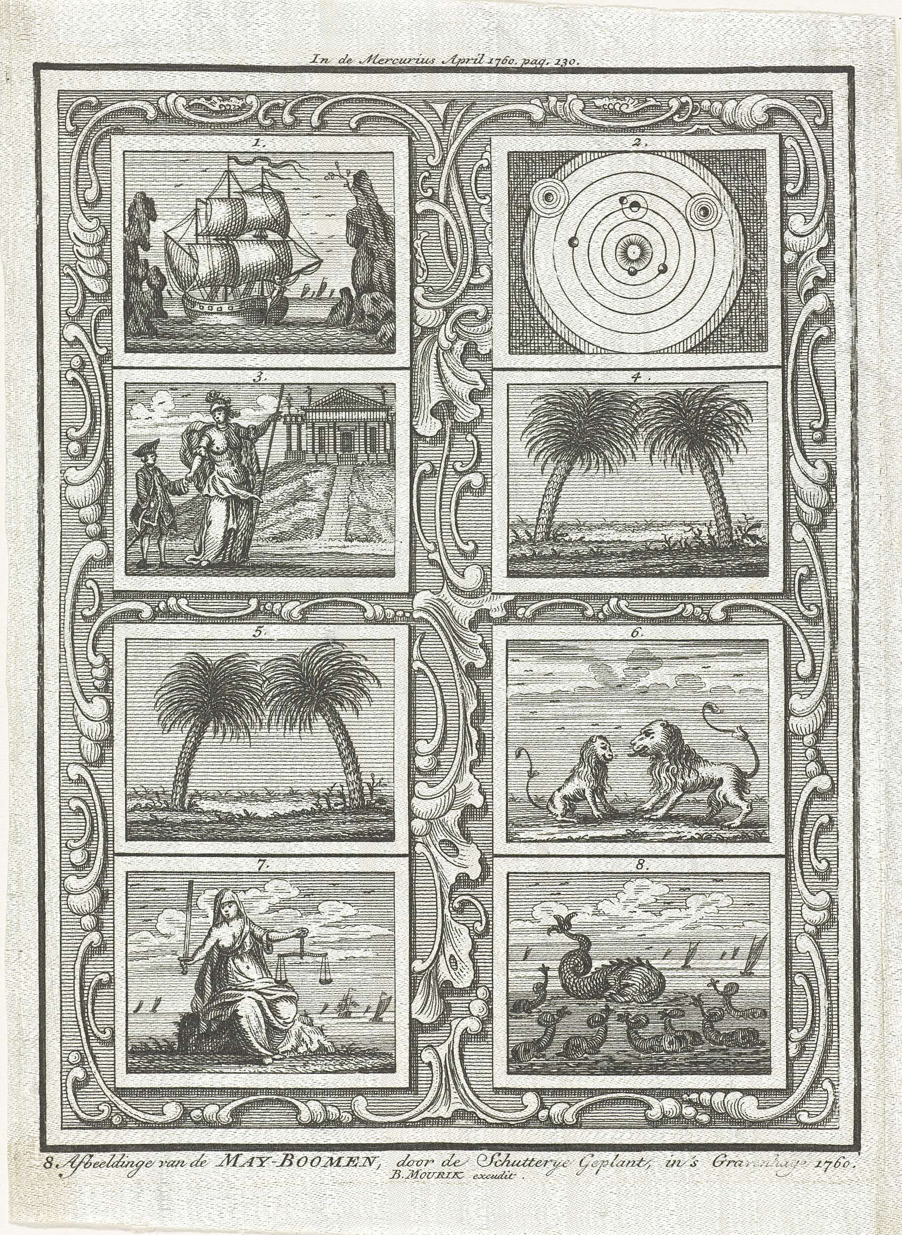 De acht allegorische voorstellingen of emblemen van de meiboom geplant door de Schutterij van Den Haag in het jaar 1760.