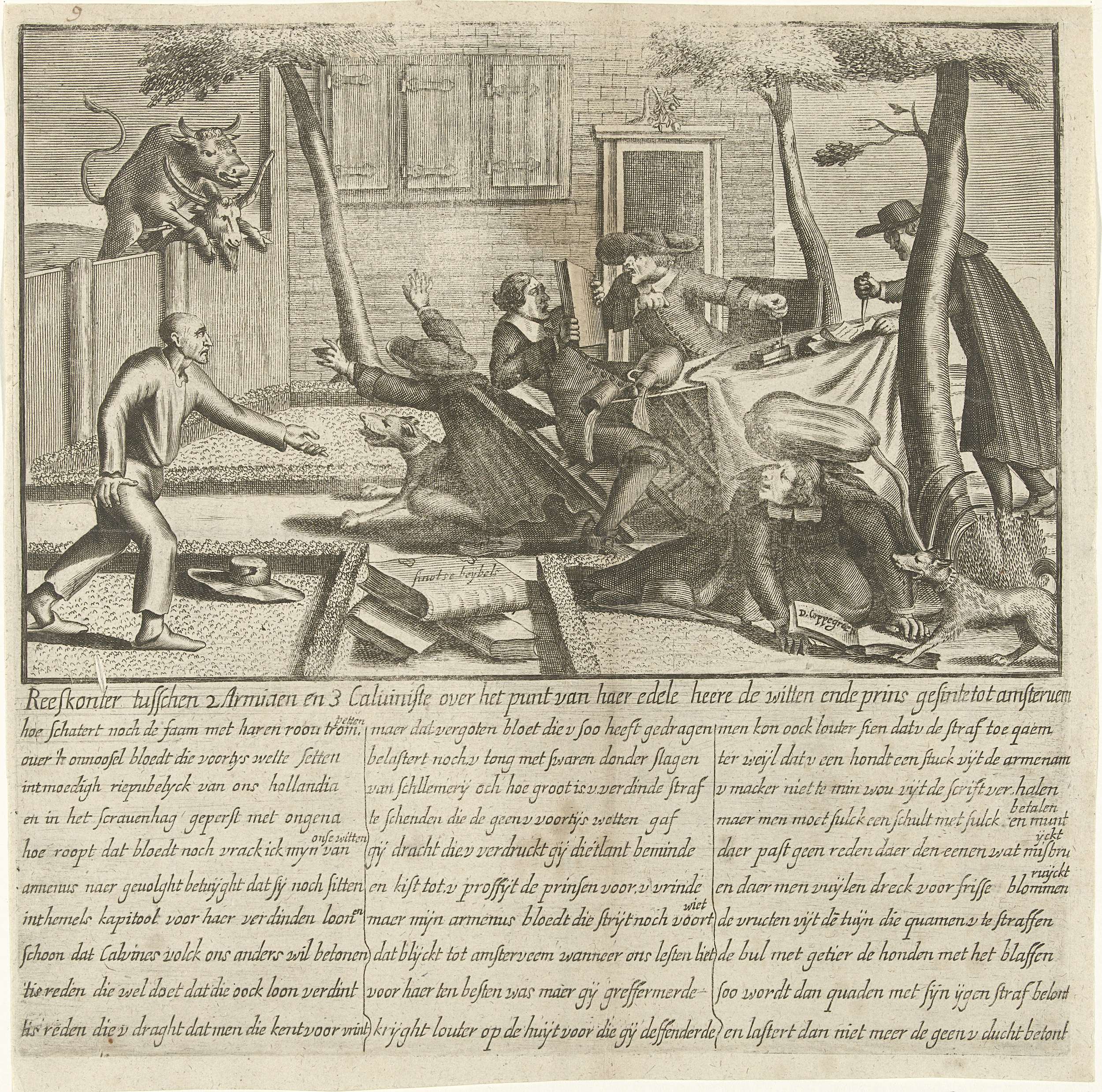 Spotprent op de strijd tussen arminianen en calvinisten over de geboeders De Witt en de prinsgezinden te Amsterdam, waarschijnlijk ca. 1758. Arminianen en calvinisten gaan rond een tafel in een tuin met elkaar op de vuist, reden zijn de afwijkende meningen over de strijd tussen de gebroeders De Witt en de prins in 1672. Links ...