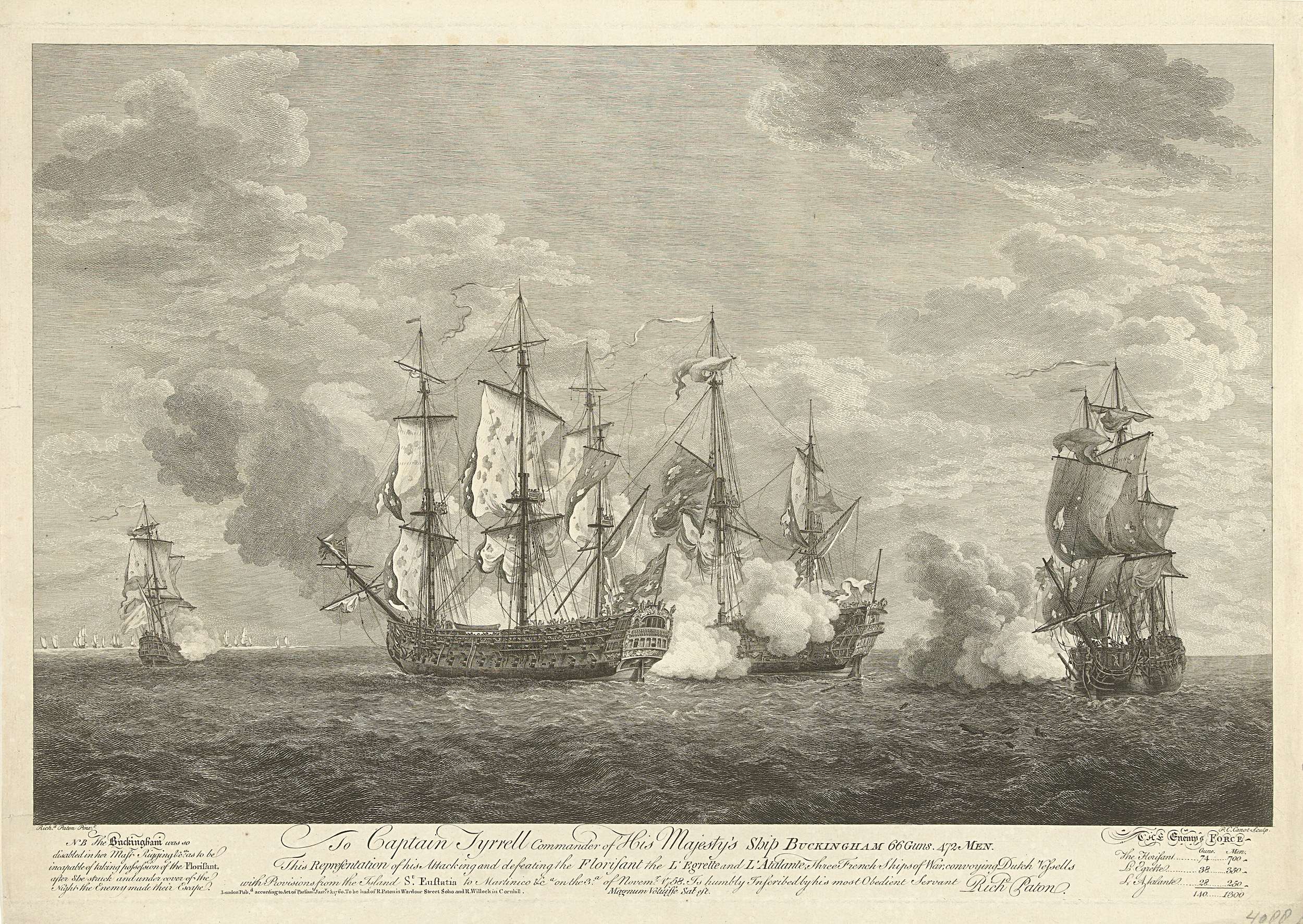 Aanval en overwinning van het Engelse oorlogsschip Buckingham onder commando van kapitein Richard Tyrrell op de Florissant en twee andere Franse schepen die een konvooi van Hollandse schepen begeleiden onderweg van Sint Eustatius naar Sint Maarten, 3 november 1758. In het onderschrift de opdracht aan de Engelse kapitein en details over de Franse schepen.
