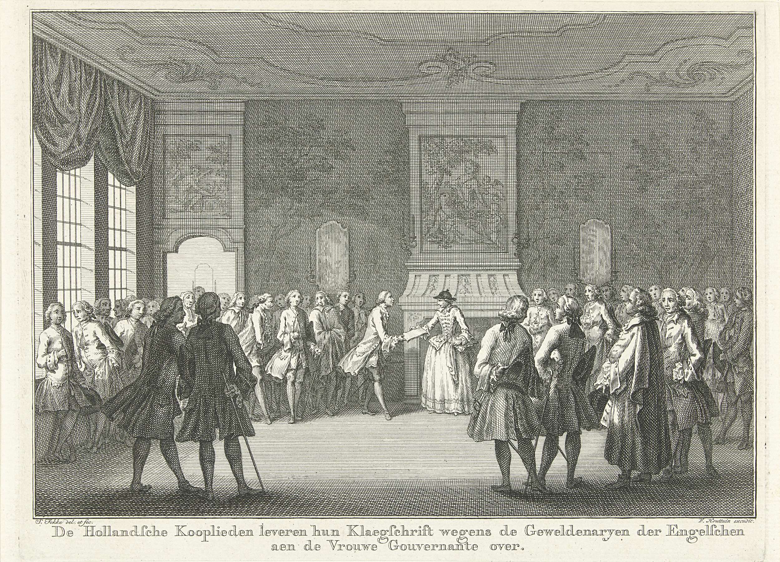 Een delegatie van Hollandse kooplieden overhandigt aan de gouvernante (prinses Anna van Hannover) een klaagschrift over de Engelse aanvallen, 7 december 1758. Waarschijnlijk naar aanleiding van overvallen door de Engelsen op Nederlandse schepen in de Antillen.