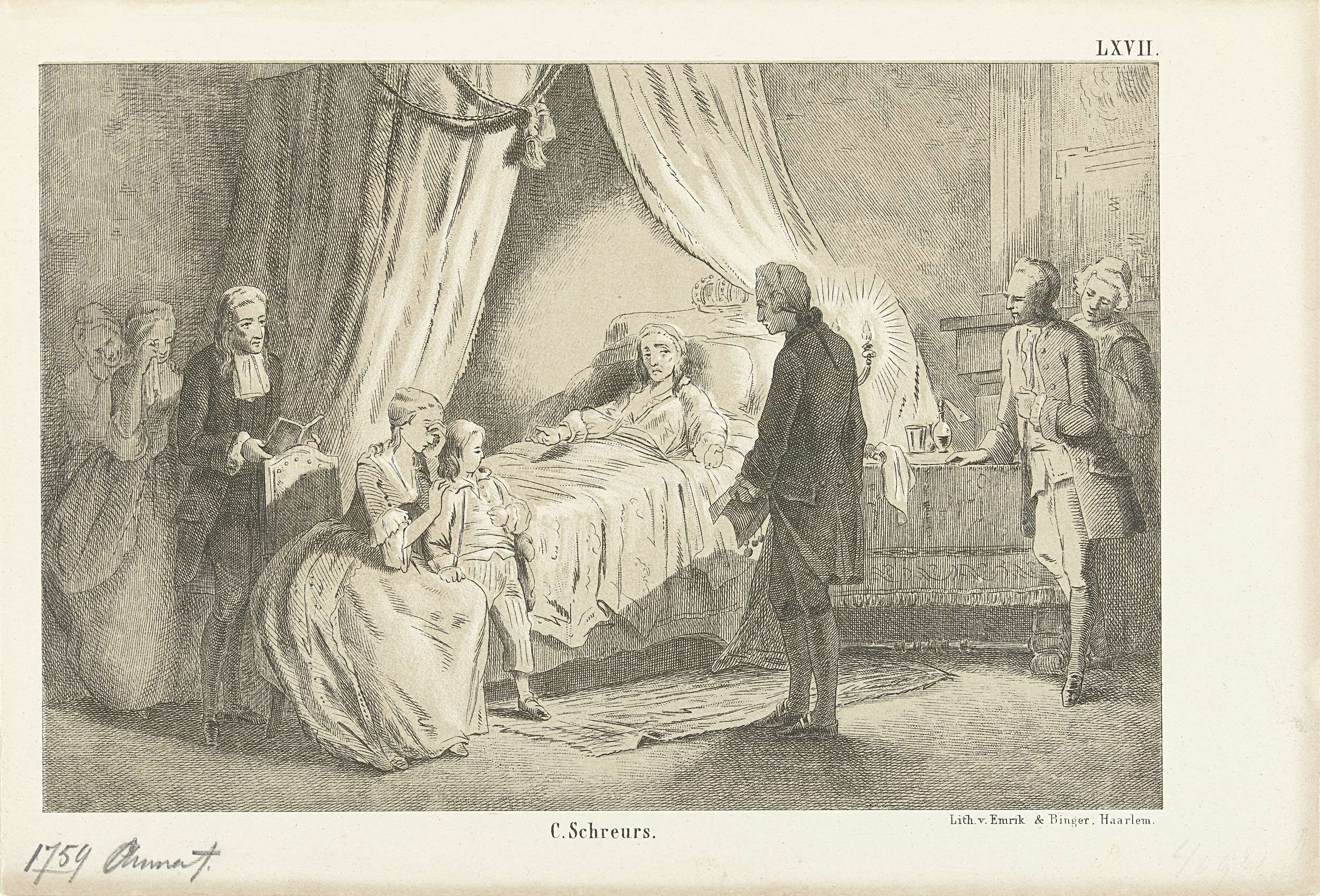 Het overlijden van prinses Anna van Hannover op 12 januari 1759. Prins Willem V en prinses Carolina en anderen om het sterfbed. Genummerd rechtsboven: LXVII.