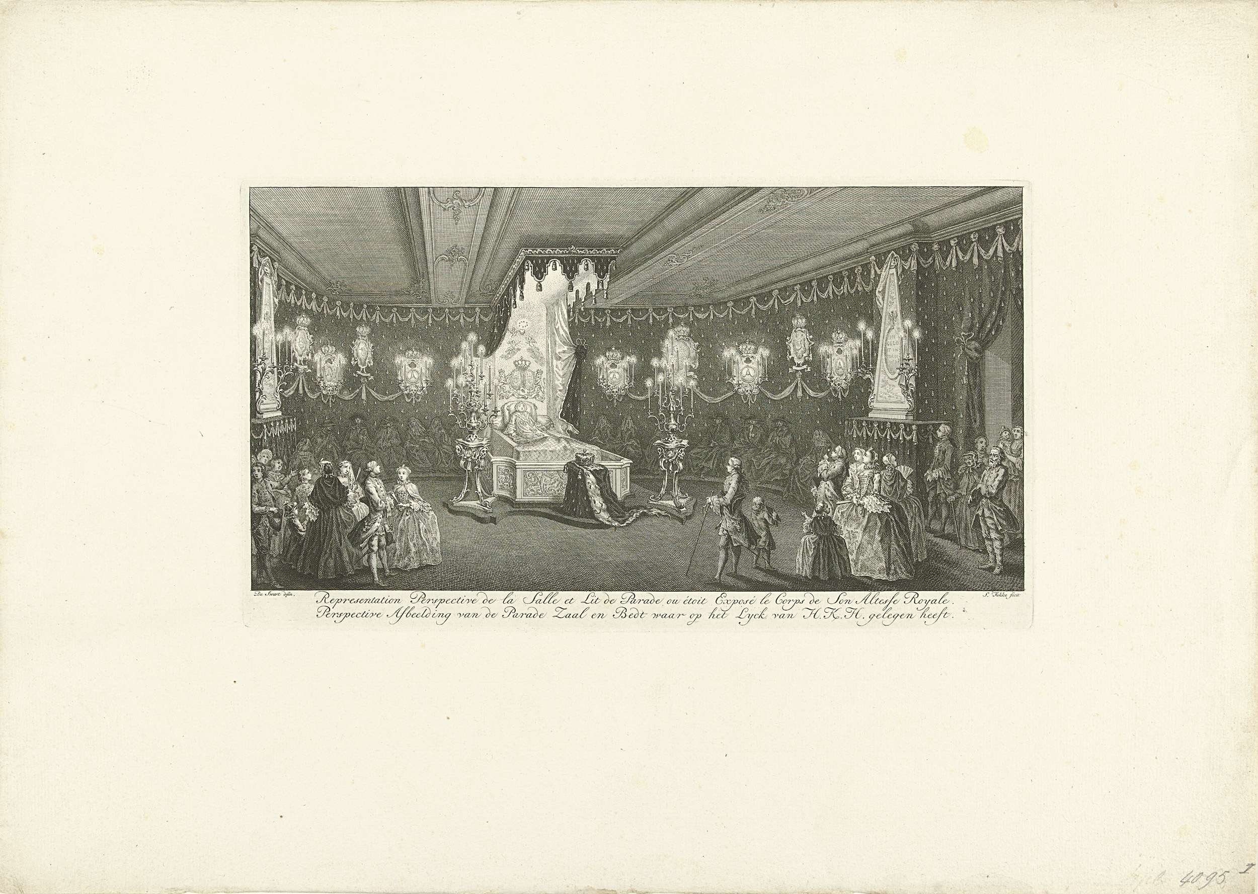 Paradezaal met het praalbed en bezoekers. Onderdeel van een serie van vier platen van het praalbed waarop de op 12 januari 1759 overleden prinses Anna van Hannover gedurende enkele dagen in februari opgebaard heeft gelegen.