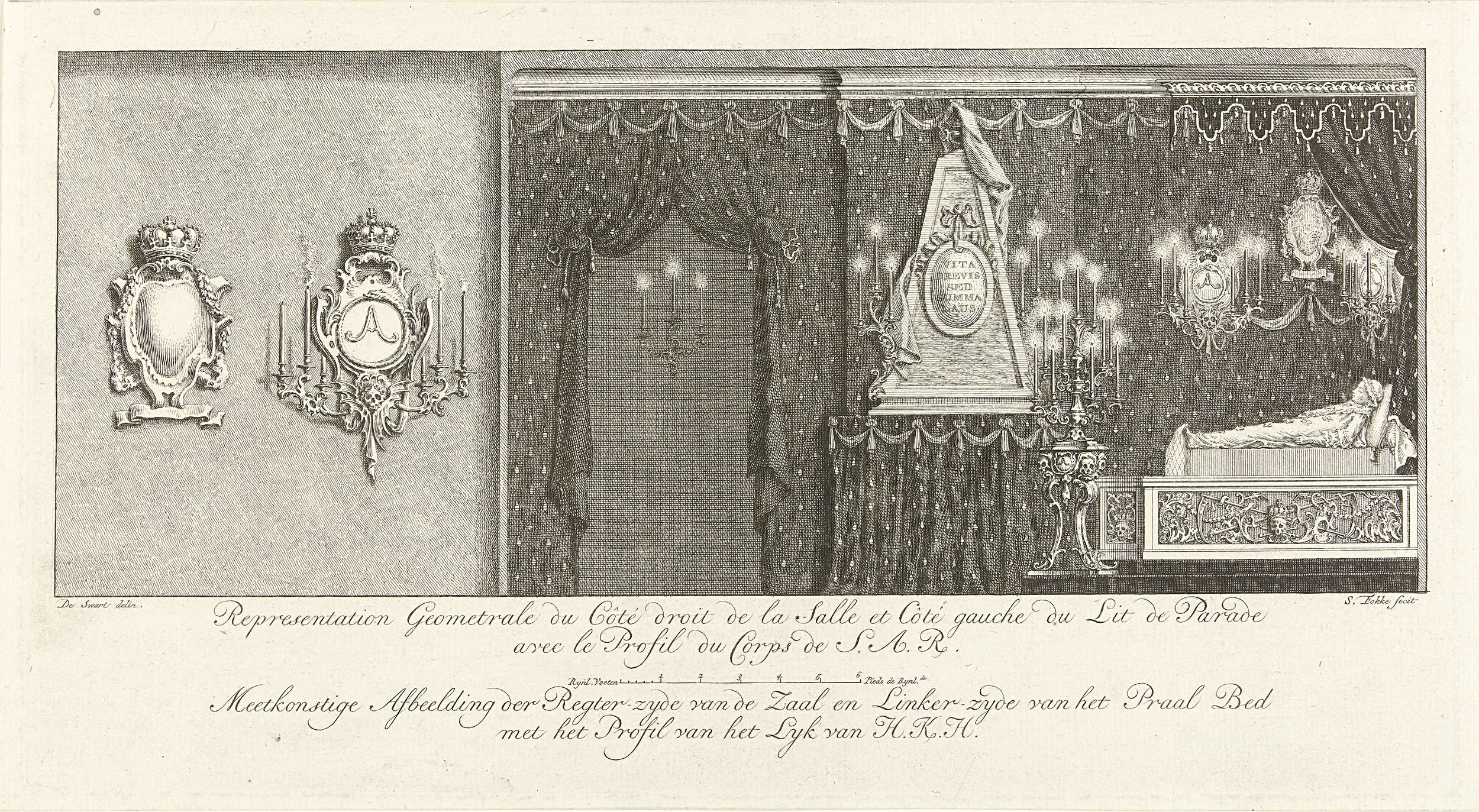 Paradezaal met zijaanzicht van het praalbed met het opgebaarde lijk van de prinses. Onderdeel van een serie van vier platen van het praalbed waarop de op 12 januari 1759 overleden prinses Anna van Hannover gedurende enkele dagen in februari opgebaard heeft gelegen.