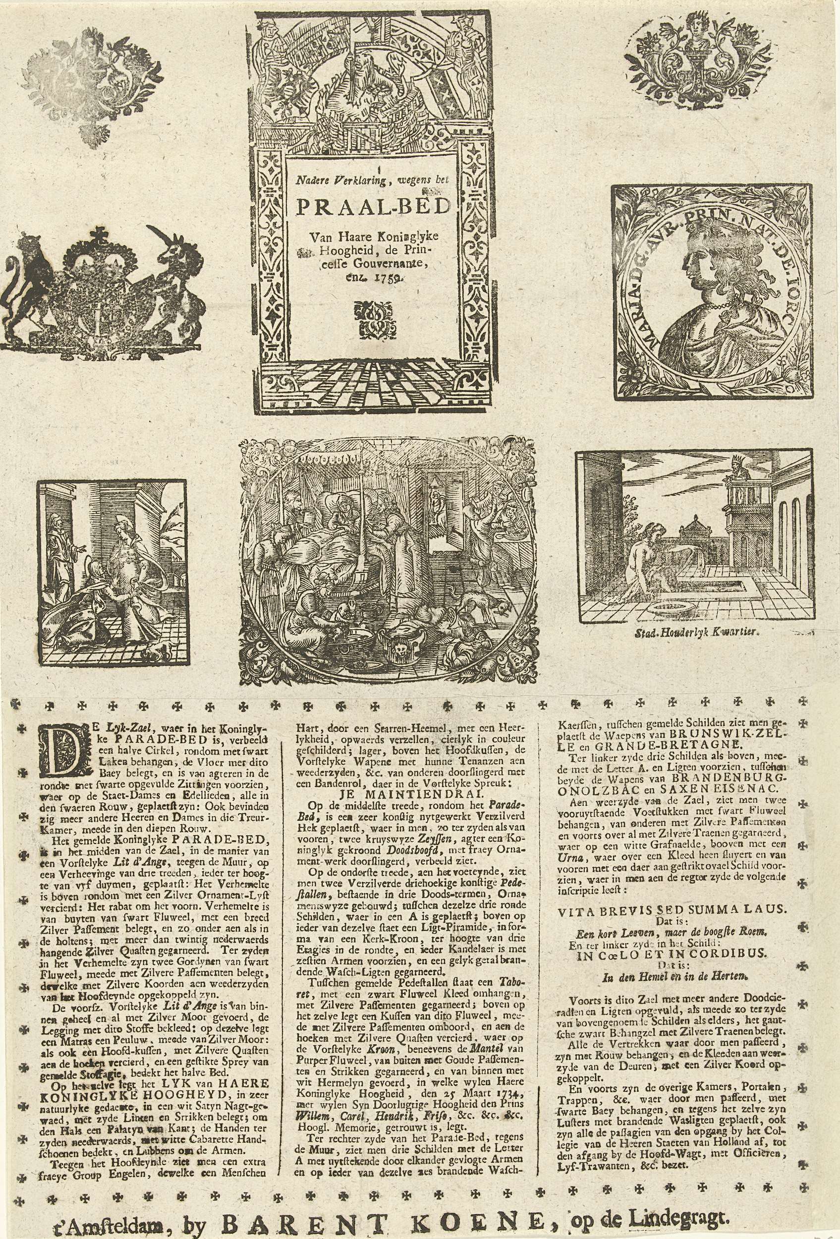 Blad met in drie kolommen een beschrijving van de paradezaal en het praalbed waarop de op 12 januari 1759 overleden prinses Anna van Hannover gedurende enkele dagen in februari opgebaard heeft gelegen. Op de bovenste helft van het blad staan acht oude houtsneden met diverse onderwerpen waaronder een kraambed en enkele bijbelse scènes.