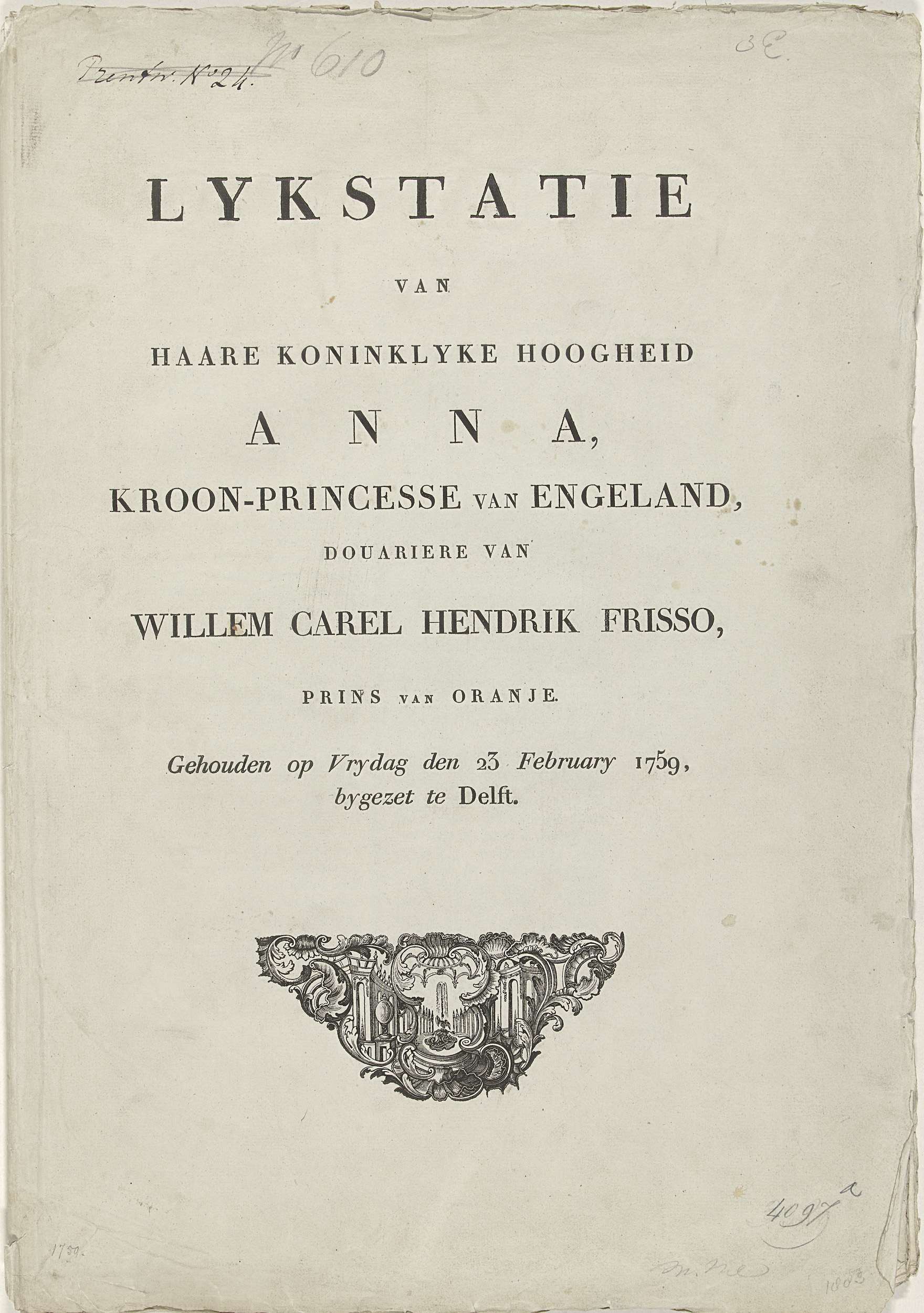 Omslag met titel met op 27 gedrukte bladzijden de beschrijving van de de lijkstatie. Onderaan een drukkersvignet. Onderdeel van een serie van 16 platen plus een gedrukte beschrijving van de lijkstatie van de op 12 januari 1759 overleden en op 23 februari te Delft begraven prinses Anna van Hannover.