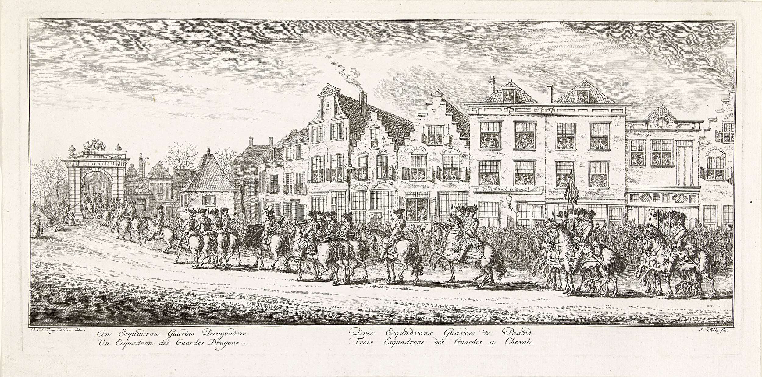 Gardes Dragonders en gardes te paard, voorafgegaan door trompetters en trommelslagers. Aankomst bij de Haagse Poort te Delft. Onderdeel van een serie van 16 platen plus een gedrukte beschrijving van de lijkstatie van de op 23 februari 1759 te Delft begraven prinses Anna van Hannover. Ongenummerd.