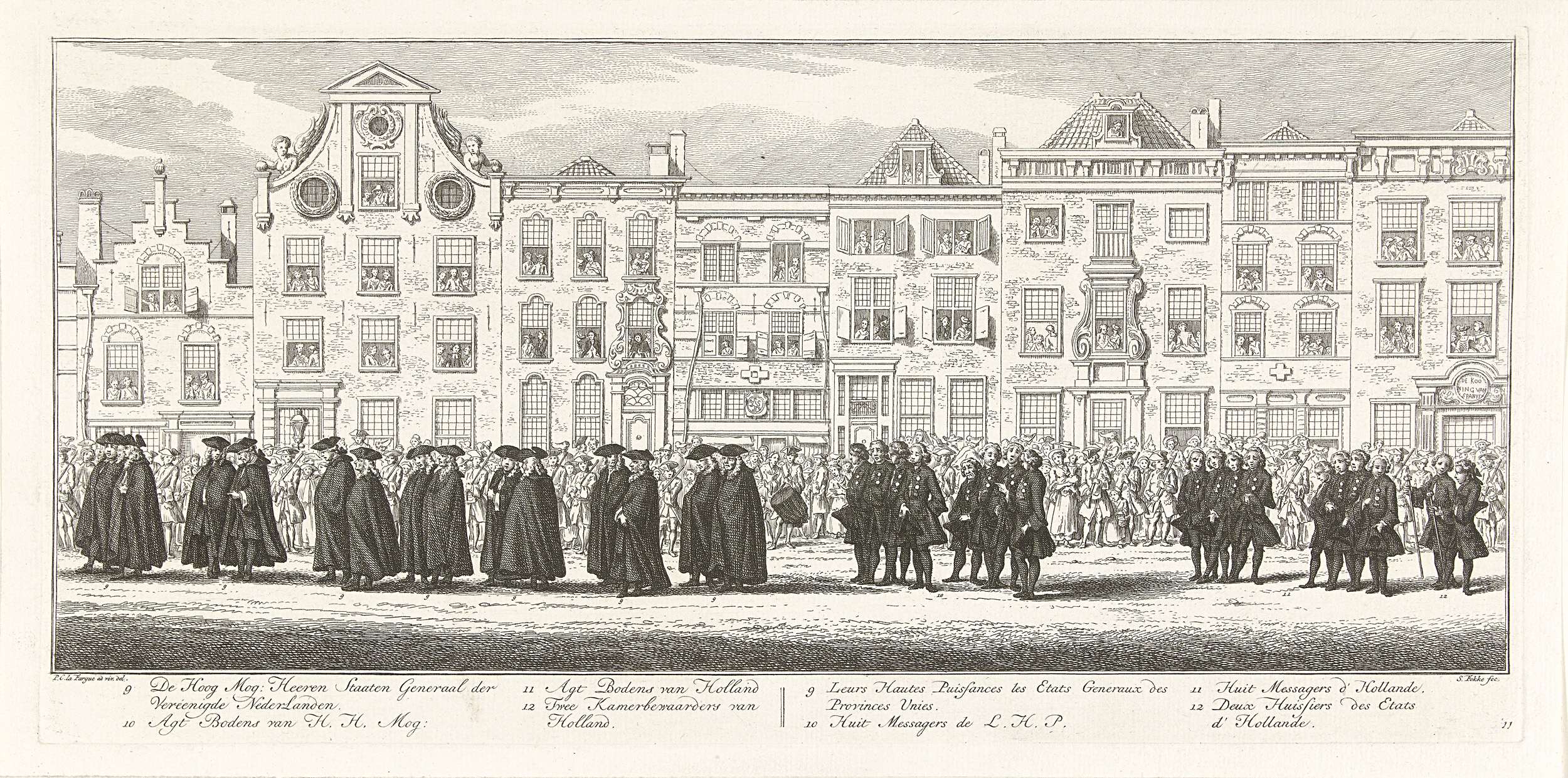 Leden van de Staten-Generaal en personeel van de Staten van Holland. Onderdeel van een serie van 16 platen plus een gedrukte beschrijving van de lijkstatie van de op 23 februari 1759 te Delft begraven prinses Anna van Hannover. Genummerd rechtsonder: 11.
