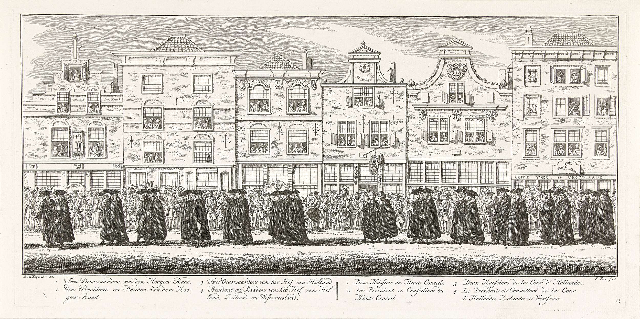 Leden en personeel van de Hoge Raad en Hof van Holland. Onderdeel van een serie van 16 platen plus een gedrukte beschrijving van de lijkstatie van de op 23 februari 1759 te Delft begraven prinses Anna van Hannover. Genummerd rechtsonder: 13.