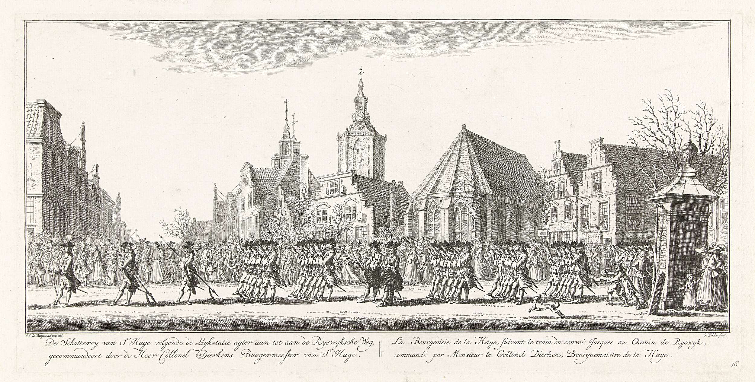Schutterij van Den Haag, op de achtergrond de Grote of Sint-Jacobskerk te Den Haag. Onderdeel van een serie van 16 platen plus een gedrukte beschrijving van de lijkstatie van de op 23 februari 1759 te Delft begraven prinses Anna van Hannover. Genummerd rechtsonder: 16.