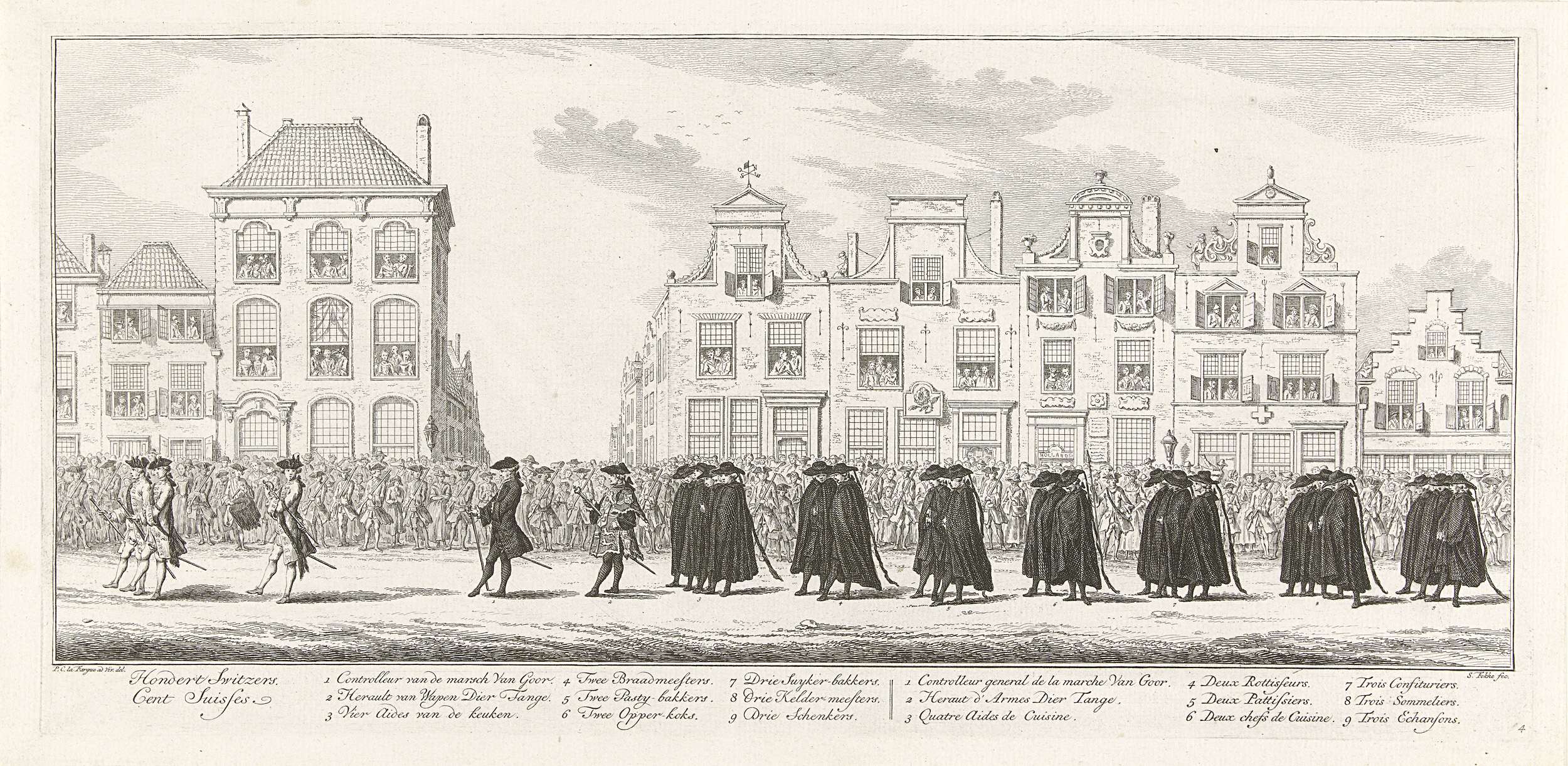 De Cent-Suisses en leden van de stadhouderlijke hofhouding. Onderdeel van een serie van 16 platen plus een gedrukte beschrijving van de lijkstatie van de op 23 februari 1759 te Delft begraven prinses Anna van Hannover. Genummerd rechtsonder: 4.