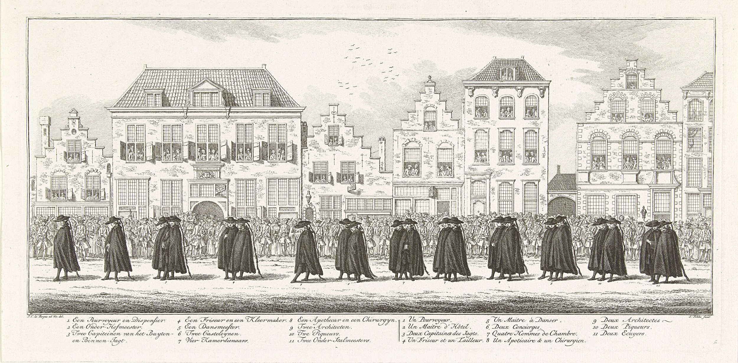 Leden van de stadhouderlijke hofhouding. Onderdeel van een serie van 16 platen plus een gedrukte beschrijving van de lijkstatie van de op 23 februari 1759 te Delft begraven prinses Anna van Hannover. Genummerd rechtsonder: 5.