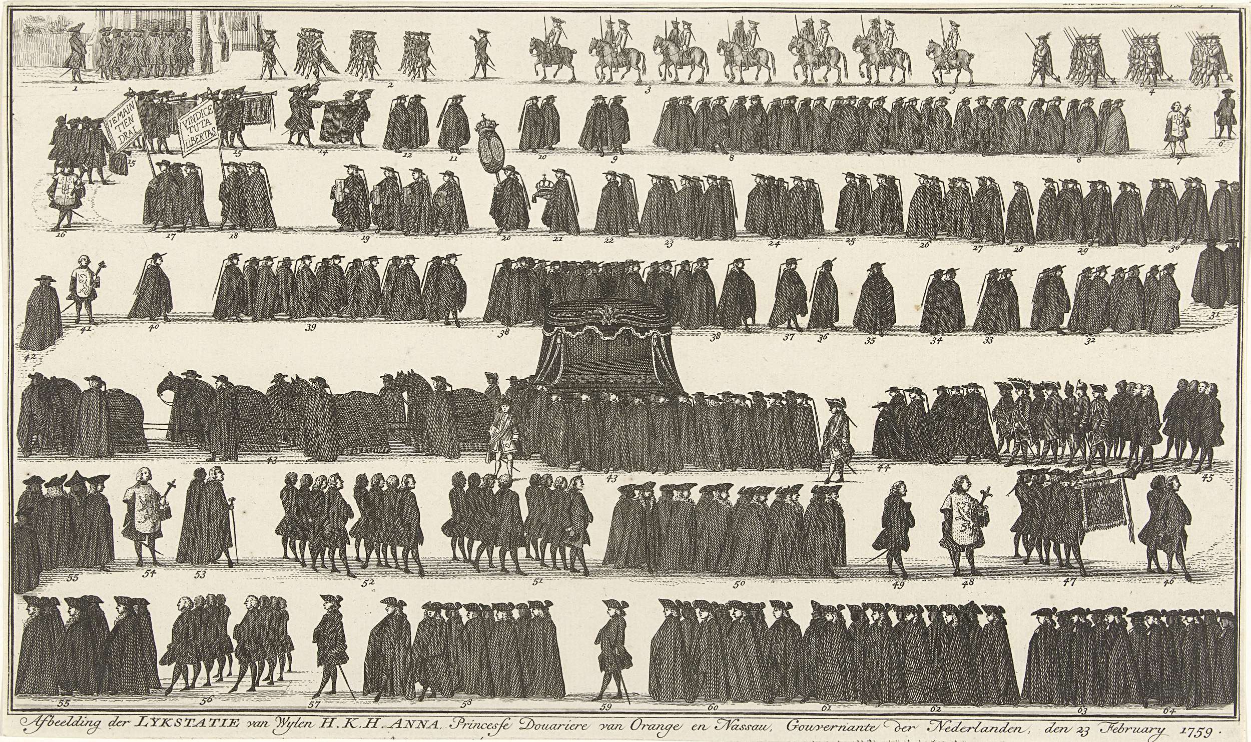 De lijkstatie van de op 23 februari 1759 te Delft begraven prinses Anna van Hannover. De stoet afgebeeld in zeven rijen onder elkaar. Details in de voorstelling genummerd 1-64.