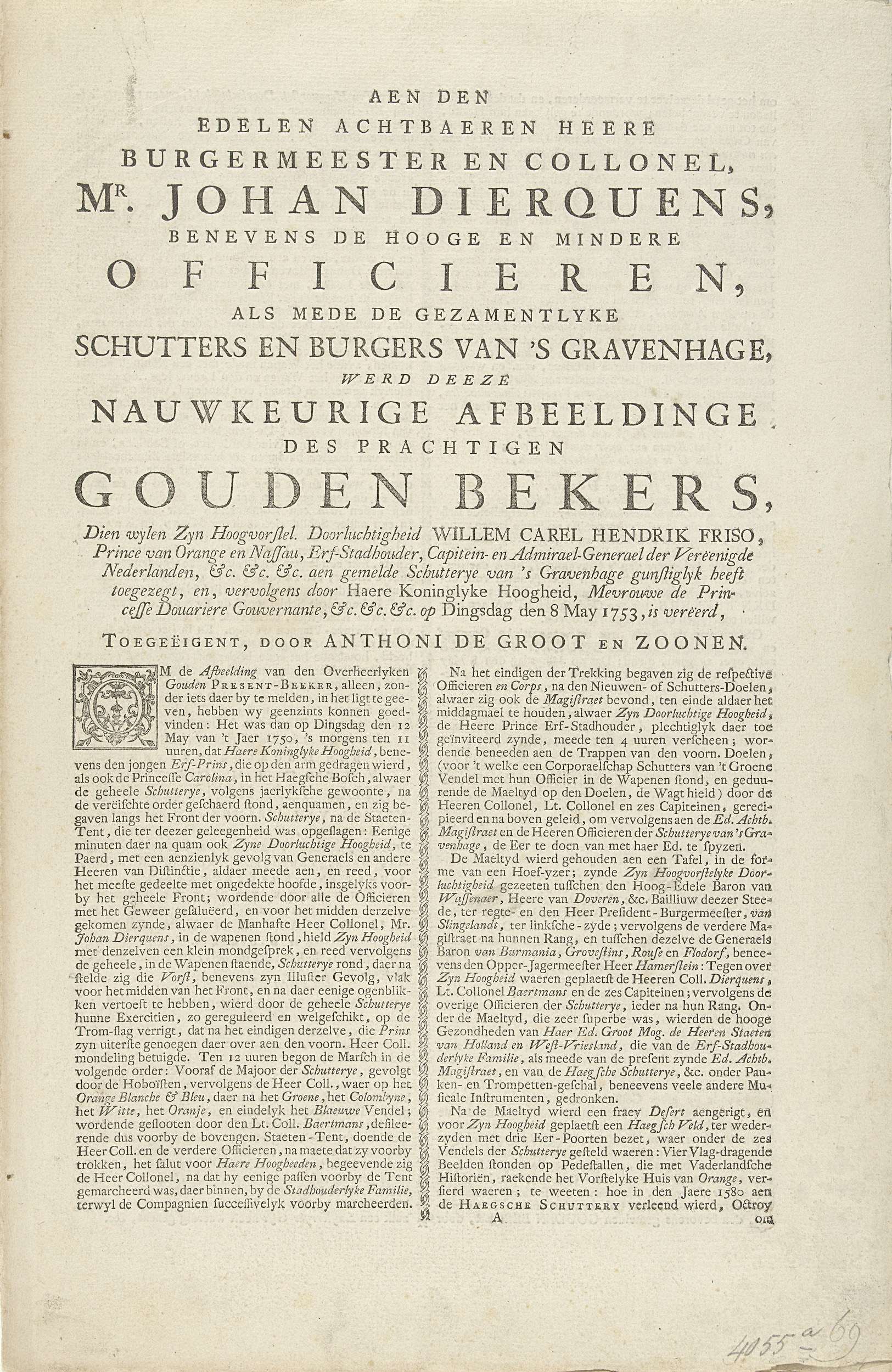 Tekstblad met een beschrijving van de gouden beker door stadhouder Willem IV toegezegd aan de Haagse schutterij en na zijn dood gepresenteerd door prinses Anna op 8 mei 1753. De beker vervaardigd door Philippe Métayer te Amsterdam. Dubbelgevouwen blad op drie zijden bedrukt met de beschrijving en een vers.