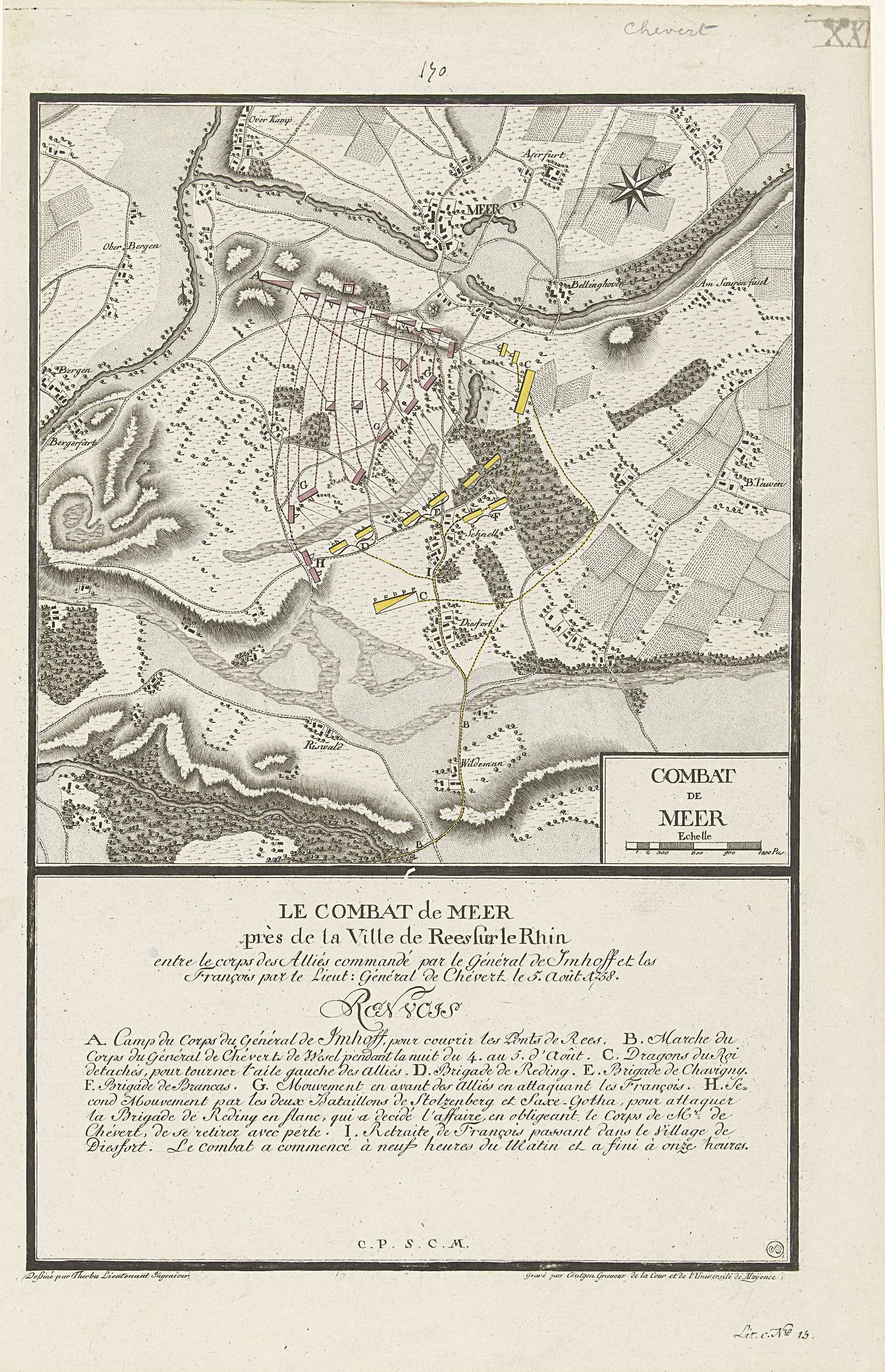 Plattegrond van de veldslag bij het plaatsje Meer in de buurt van Rees tussen de geallieerden onder generaal Philipp Freiherr von Imhoff en de Fransen onder general François de Chévert, 5 augustus 1758. Onder de voorstelling een tekstdeel met titel en legenda A-I in het Frans.