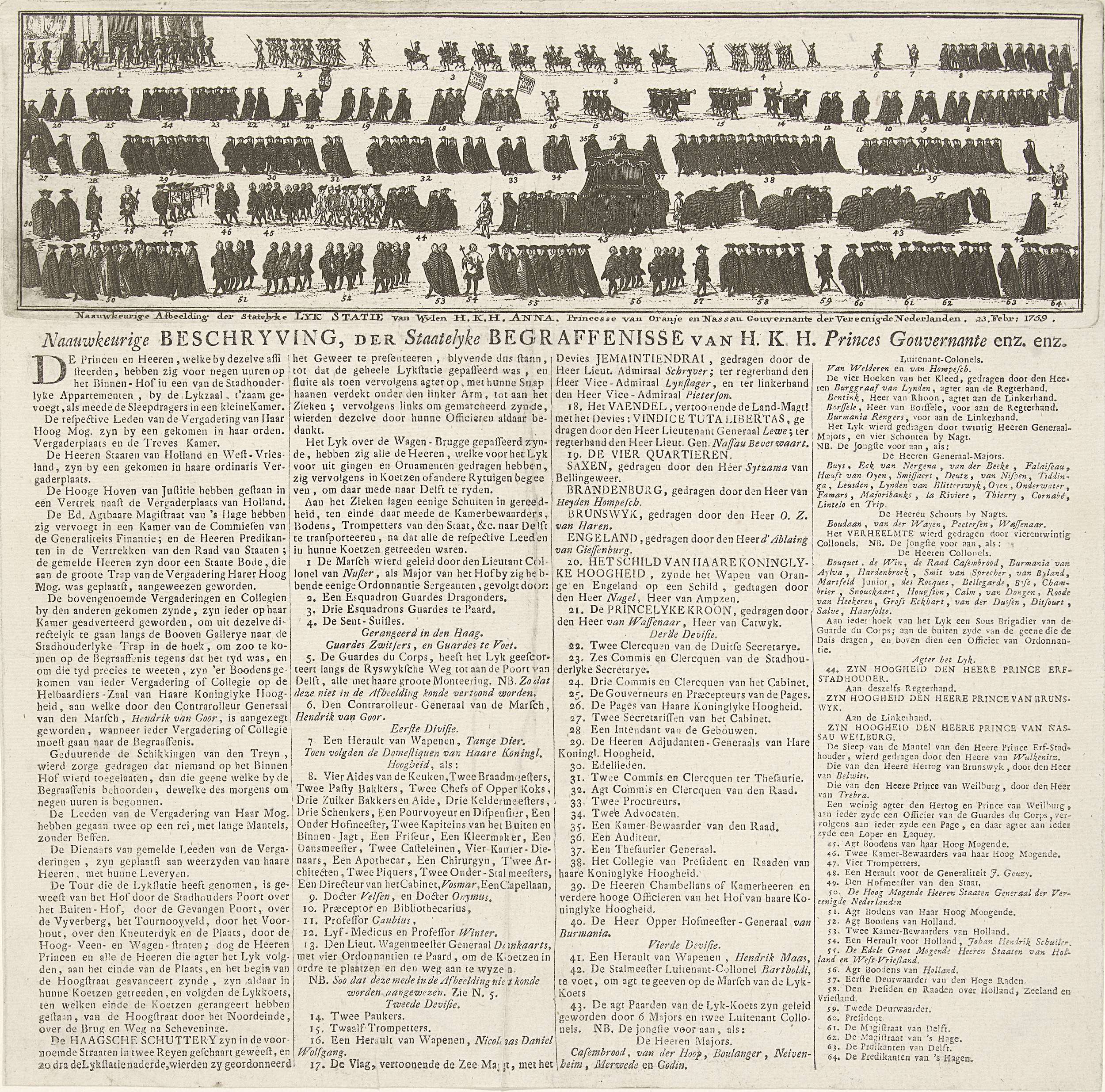 De lijkstatie van de op 23 februari 1759 te Delft begraven prinses Anna van Hannover. De stoet afgebeeld in vijf rijen onder elkaar. Details in de voorstelling genummerd 1-64. Op het blad onder de plaat een beschrijving van de gebeurtenissen en de legenda 1-64 in 4 kolommen.