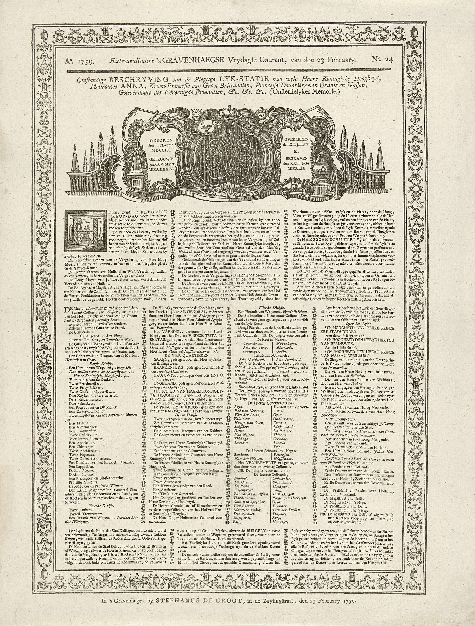 Extra editie van de 's Gravenhaegse Vrijdagse Courant van 23 februari 1759 No. 24. Met een beschrijving van de lijkstatie van prinses Anna op 23 februari 1759. Bovenaan een allegorisch vignet met het monogram van de prinses. Blad in een ornamentele rand met doodskoppen, gedoofde fakkels en andere symbolen van de dood.