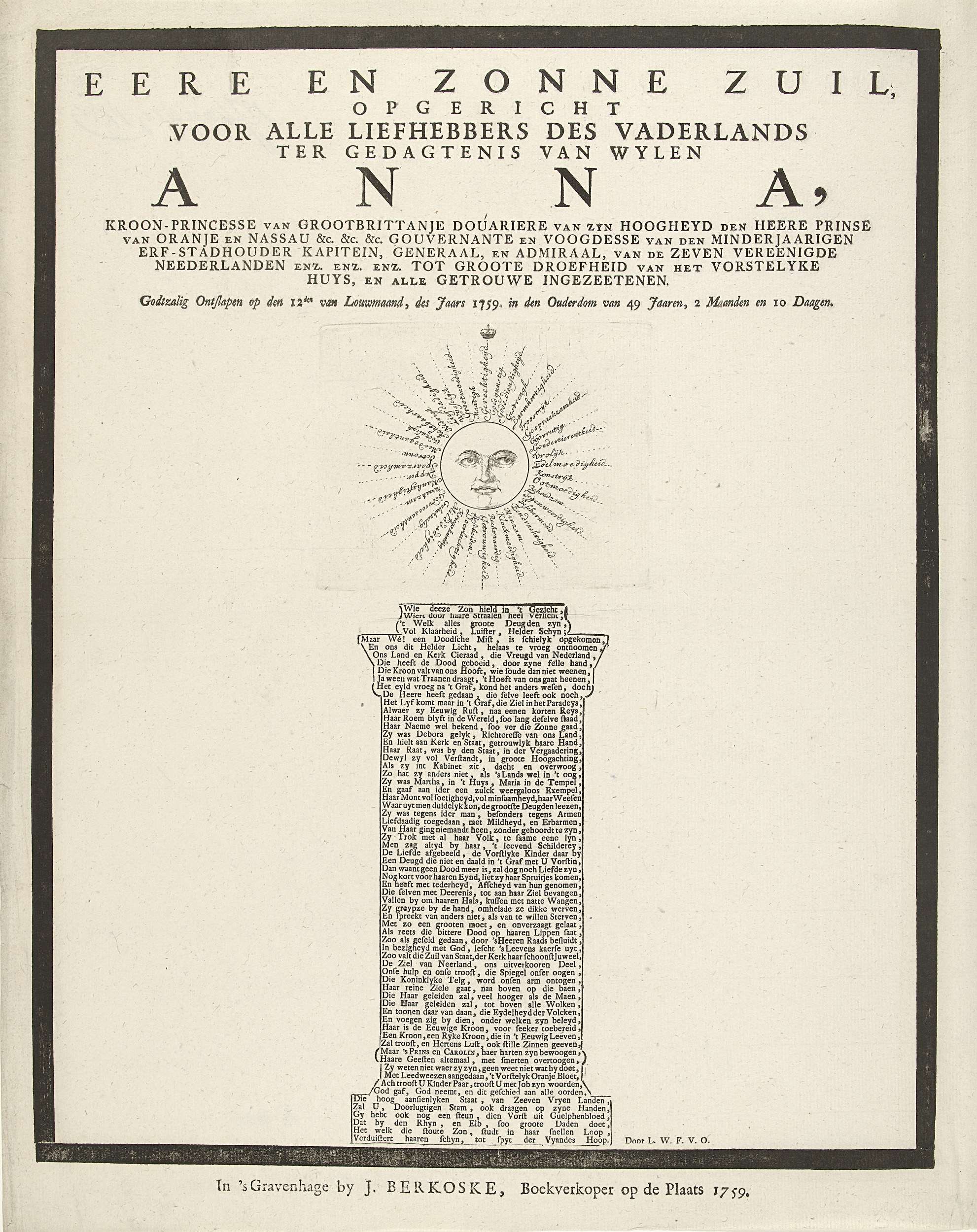 Vers op een kolom of zuil bekroond door een zon. De zonnestralen worden gevormd door alle deugdzame kenmerken van de overleden prinses. Naar aanleiding van het overlijden van prinses Anna van Hannover op 12 januari 1759. Het blad met een dikke zwarte rouwrand.