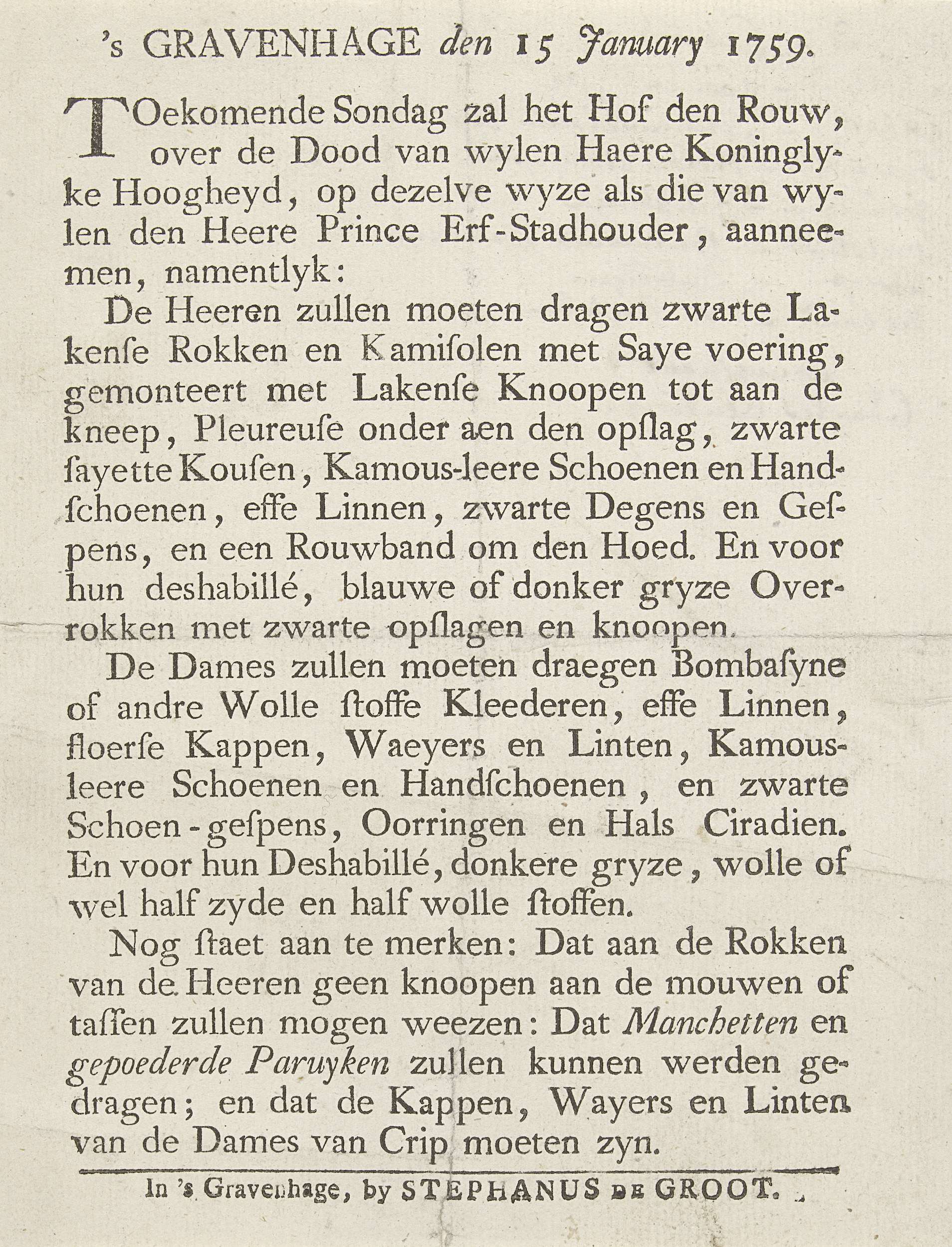 Bekendmaking over de te dragen kleding gedurende de rouwperiode na het overlijden van prinses Anna, 1759