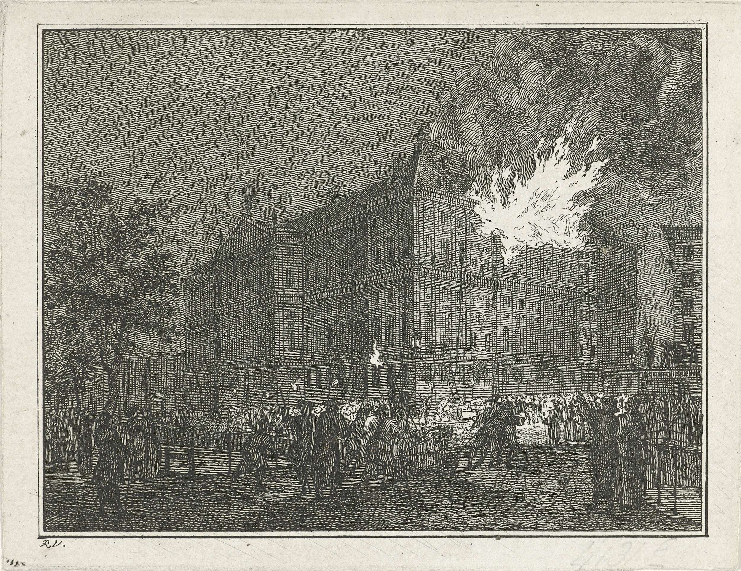 Brand in het stadhuis van Amsterdam, in de nacht van 12 op 13 oktober 1762. Brandweerlieden trekken een pomp op de brug, op straat veel toeschouwers.