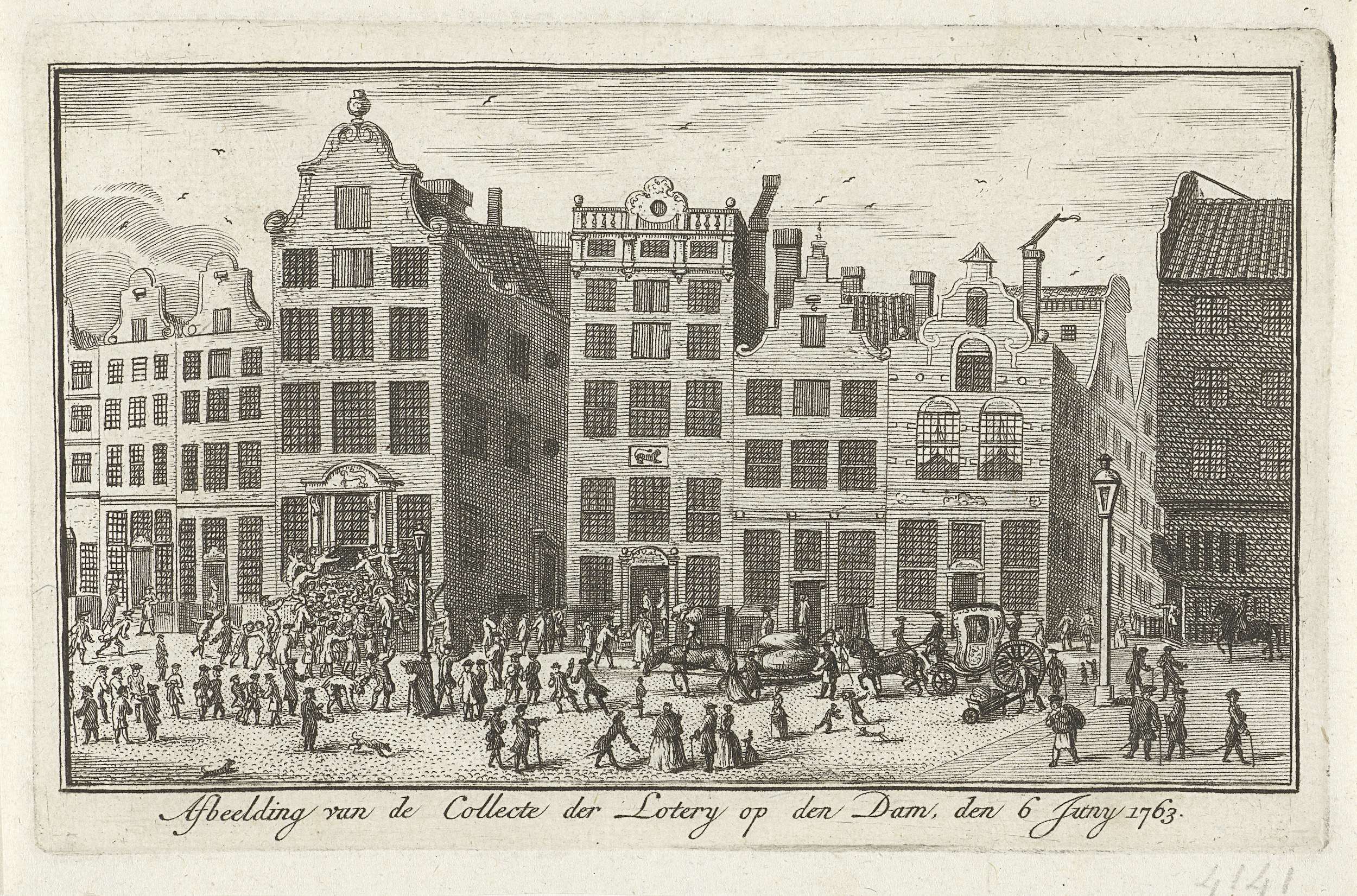 Mensen verdringen zich voor het Loterijhuis van Cretier en Kramp op de hoek van de Kromelleboogsteeg en de Dam, waar de lotenverkoop voor een loterij plaatsvindt, 6 juni 1763.