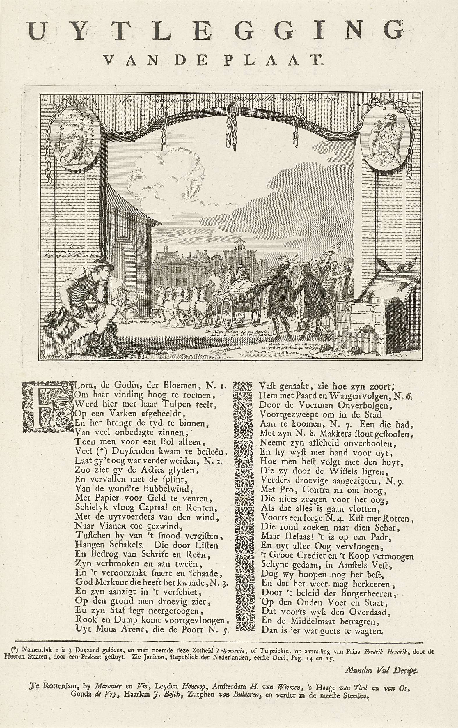 Allegorie op de zware bankroeten door de wissel-windhandel aan de Amsterdamse beurs in het jaar 1763. Een wagen met kooplieden ontvlucht de stad, andere berooide kooplieden blijven in paniek achter. Op de voorgrond een poort met twee medaillons en gebroken kettingen, links de droevige Mercurius, rechts ratten in een lege geldkist. Onder de plaat een ...