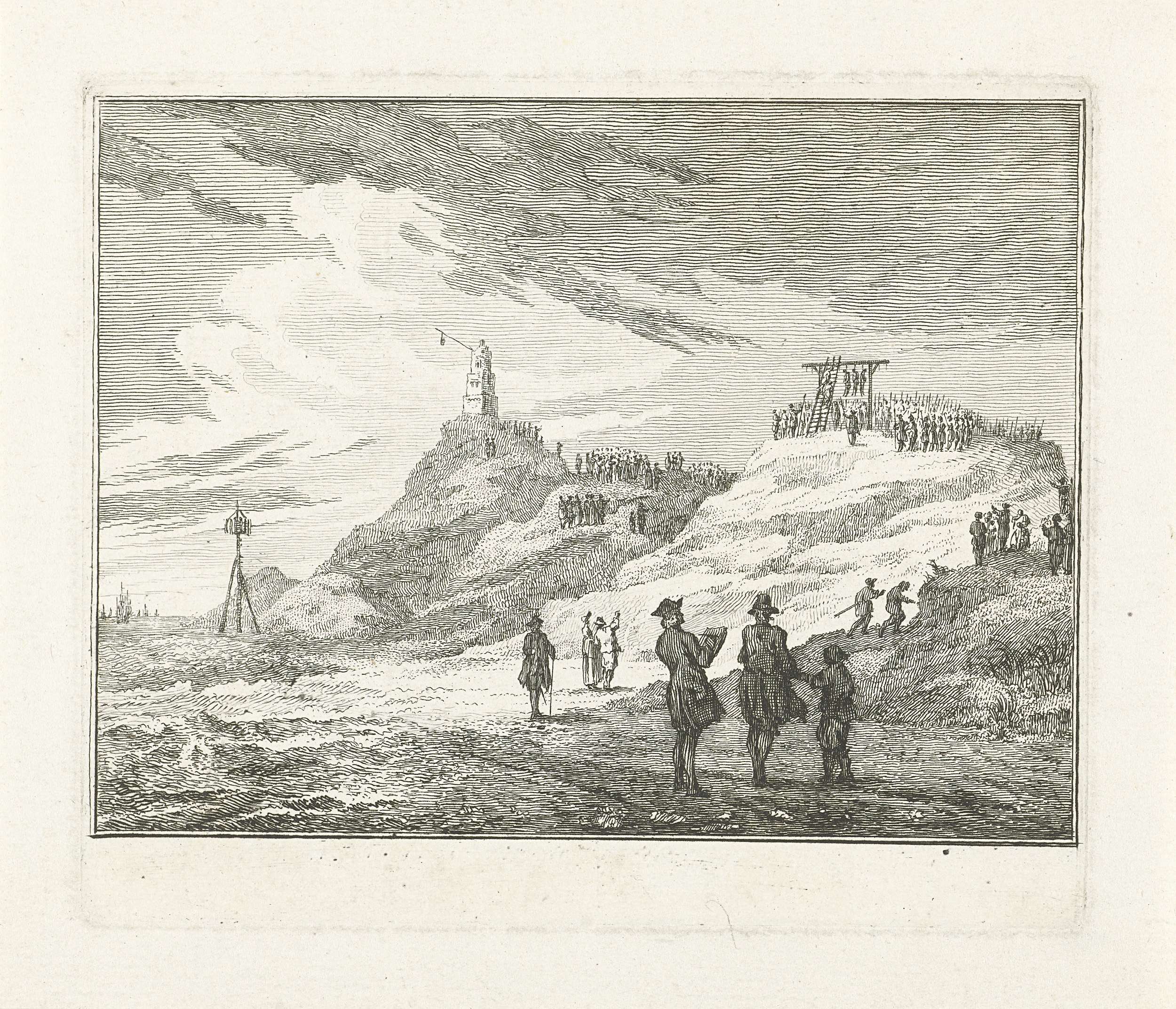 De veroordeelde muiters van het koopvaardijschip genaamd de Nijenburg worden in de duinen bij Huisduinen ter dood gebracht. In de verte een menigte rond de galgen bovenop een duin, links de hoge duin genaamd Kijkduin waarop een vuurbaken en in de verte de rede van Texel. Op de voorgrond enkele personen waaronder een tekenaar.